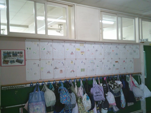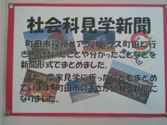 3年生の廊下には、社会科見学に行ったときのことをまとめた「社会科見学新聞」が登場しました。町田市役所、JAアグリハウスまちだの2ヶ所の見学に加えて、農家さん見学のこともまとめられています。