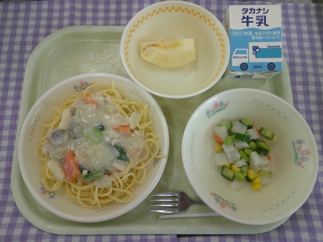 13日(木)の献立は、スパゲッティクリームソース、コロコロサラダ、果物(りんご)、牛乳です。