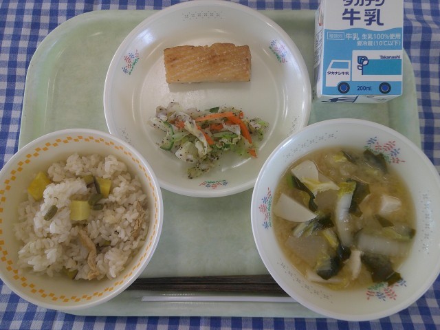 14日(金)の献立は、秋の香りご飯、いかのソイネーズ焼き、ゆかり和え、かぶと白菜のみそ汁、牛乳です。