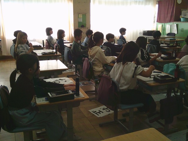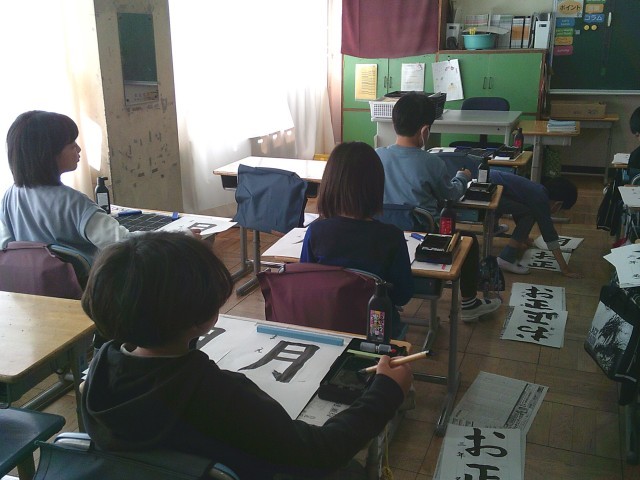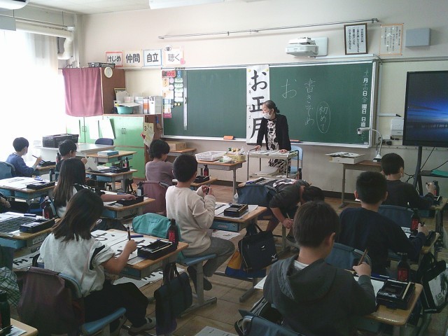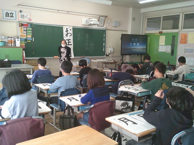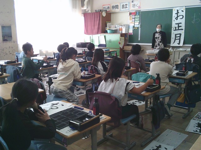 14日(金)1・2時間目、3年1組は書写の時間でした。講師の先生との学習です。書き初めの練習が始まり、子どもたちは「お正月」の3文字を何度も練習しました。「お」の二画目が真っ黒にならないように気を付けながら書いていました。