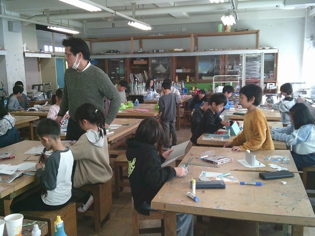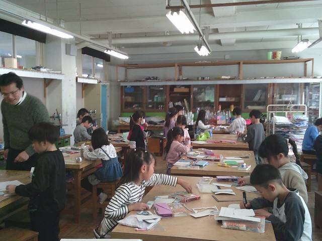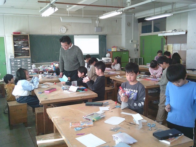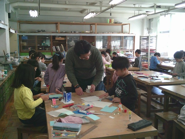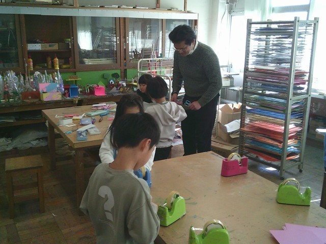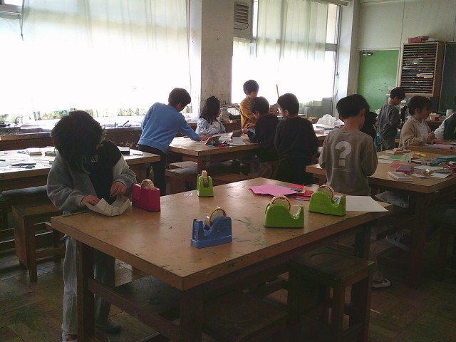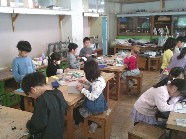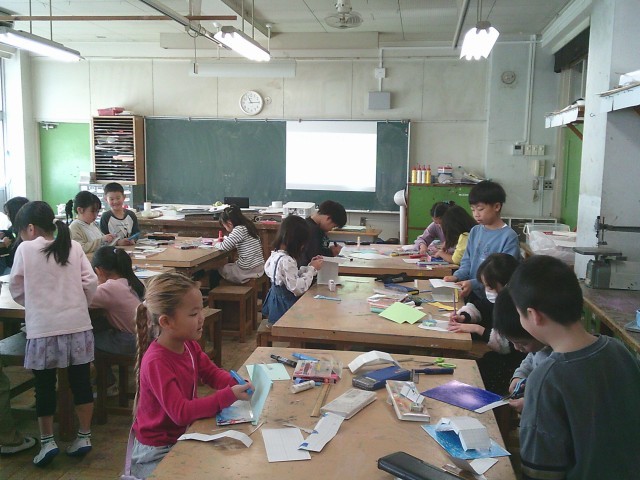 14日(金)3・4時間目、2年2組は図画工作の時間でした。「工作用紙でつくろう」と題して、紙工作に取り組みました。工作用紙を使ってすてきなおうちをつくることが今回のめあてです。はさみで切ったり、テープを貼ったりしながら、土地づくりや家づくりをしました。