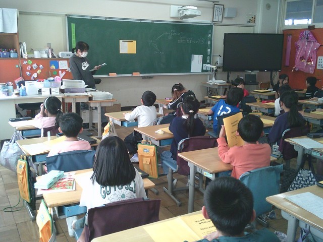 17日(月)4時間目、2年1組は生活の時間でした。来週見学に行く予定の「中央図書館」について学習をしました。子どもたちの机には黄色いしおりがありました。少し早めに終わったらしく、子どもたちが「スイミー」の音読をしていました。しかも台本を見ないで全員の子どもたちが声をそろえているのです。自分の台詞はもちろん、友達の分までしっかり覚えていました。「スイミー」を楽しんでいることが伝わってきました。