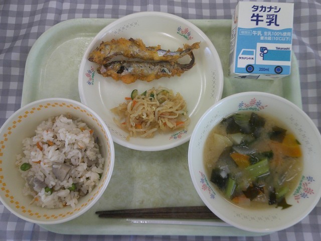 19日(水)の献立は、里芋ご飯、ししゃもの紅葉揚げ、切り干し大根のサラダ、具だくさんみそ汁、牛乳です。