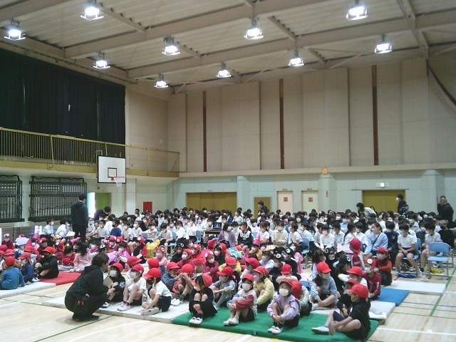 21日(金)、学習発表会児童鑑賞日です。スクリーンには大きく「学習発表会」の文字があり、体育館に入ってきた子どもたちは楽しみな気持ちをもちました。子どもたちは、マット席、児童椅子席、パイプ椅子席に分かれて座りました。はじめの言葉は2年生の担当です。2年生みんなで「始まるよ」と声を出しました。