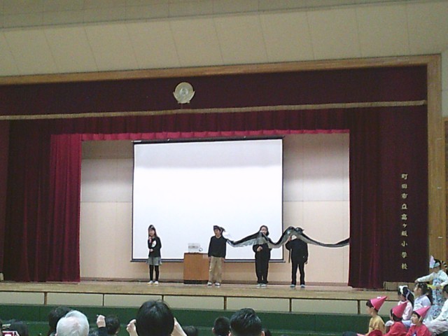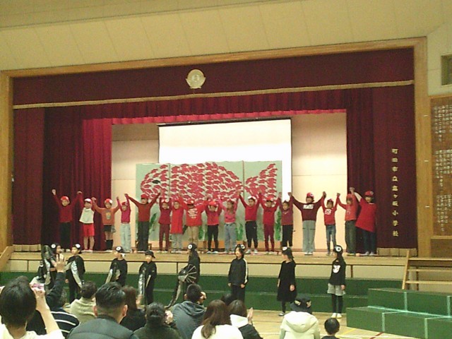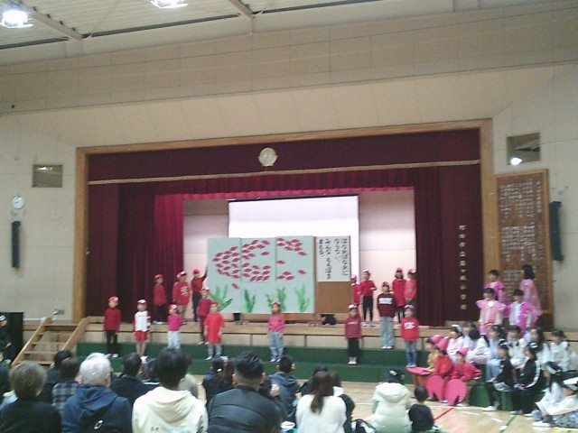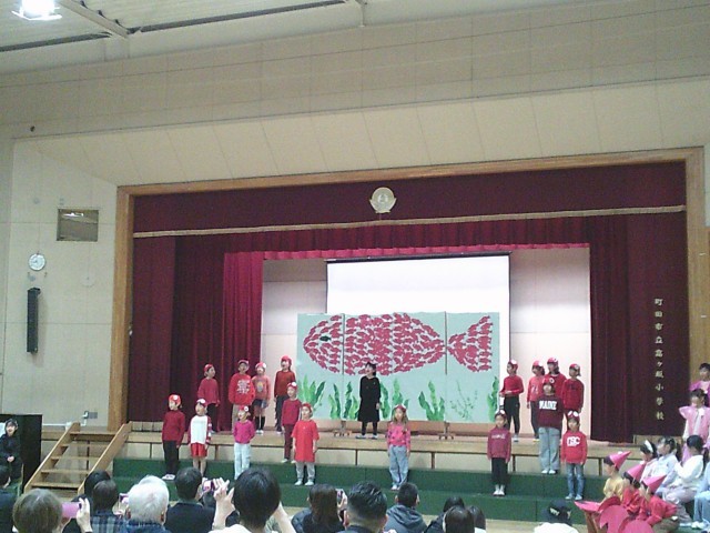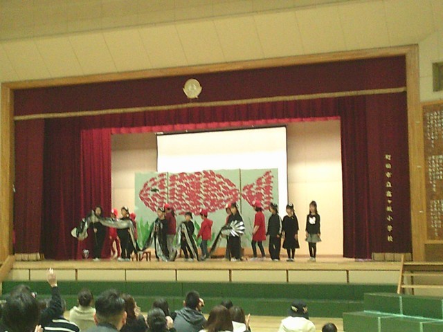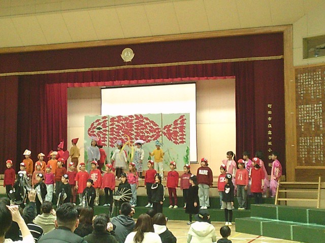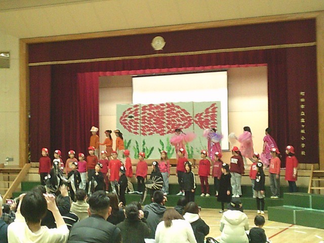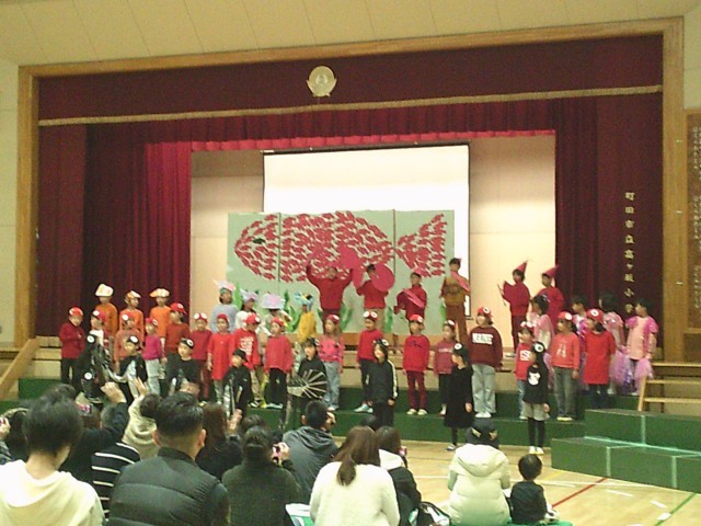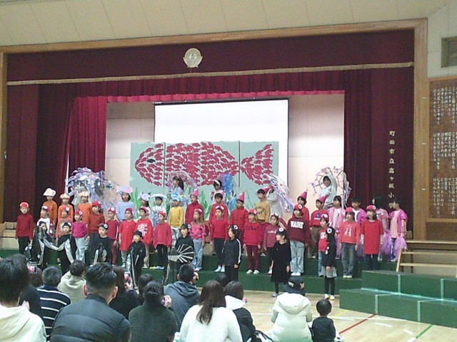 22日(土)学習発表会の2日目は保護者鑑賞日でした。朝早くから2年生の保護者の皆さまがお越しくださいました。ありがとうございました。今回は「長ーいうなぎ」と「大きな魚」、そして「退場の場面」を紹介します。最初に「長いうなぎ」を作ったけれど、ステージの半分ぐらいしかなかったのでさらに付け足したのだそうです。スイミー役の子どもたちが分担してうなぎを運びました。「大きな魚」は徐々に持ち場を守るようになった姿から、場面を変えて「大きな魚」になるところを表現しました。「退場」は役ごとに自分たちでポーズを決めてから下手側へと去っていきました。初めて学習発表会を経験しましたが、自分たちで考えながらみんなで協力して行うことができました。