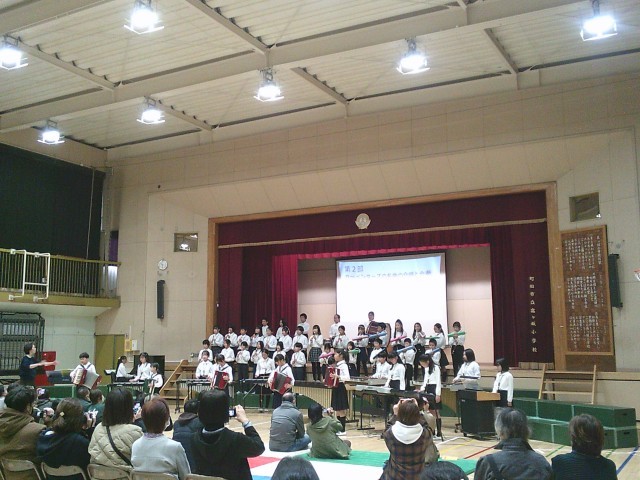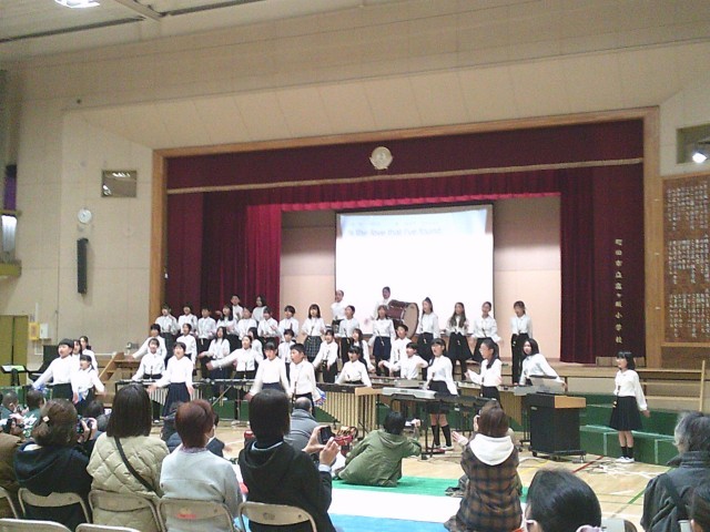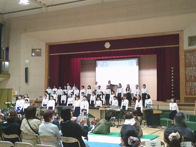 22日(金)学習発表会保護者鑑賞日の5年生の様子です。カノン進行や楽器紹介を入れながら、二部合唱「夢の世界を」と「Top of the world」の2曲を歌い、さらに「Top of the world」の合奏を披露しました。外国語の時間にALTから英語での歌い方を教えてもらい、子どもたちは発音よく上手に歌うことができました。最後に盛り上げ隊が登場し、保護者の皆さまにも手拍子で一緒に参加していただきました。ご協力ありがとうございました。