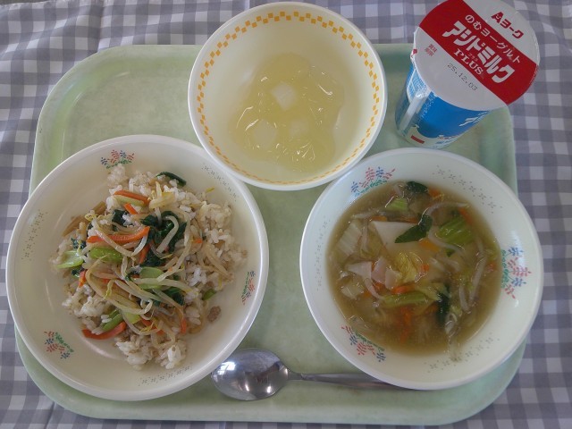 26日(水)の献立は、ビビンバ、ワンタンスープ、りんごジュレ、のむヨーグルトです。