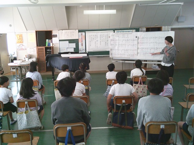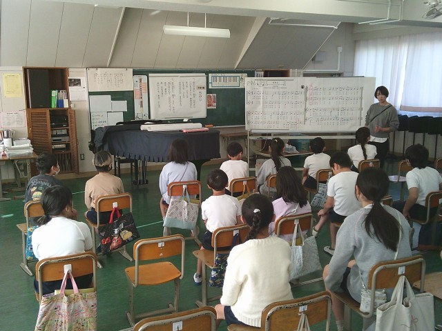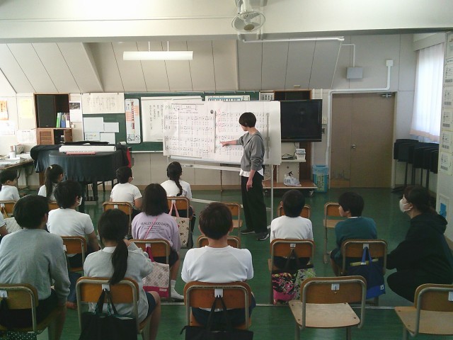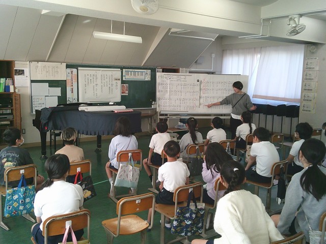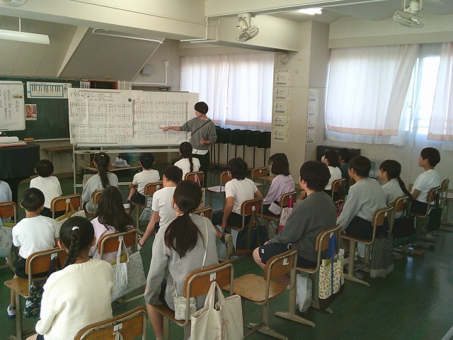26日(水)2時間目、4年2組は音楽の時間でした。今月の歌「もみじ」は4年生の教科書に載っています。今回は、「やまのふもとの すそもよう」のところを2つのパートに分かれて歌う練習をしました。子どもたちが上のパートを歌い、音楽の先生が下のパートを歌うときれいな響きが生まれました。これを反対にした練習もしましたが、少し自信がなさそうでした。