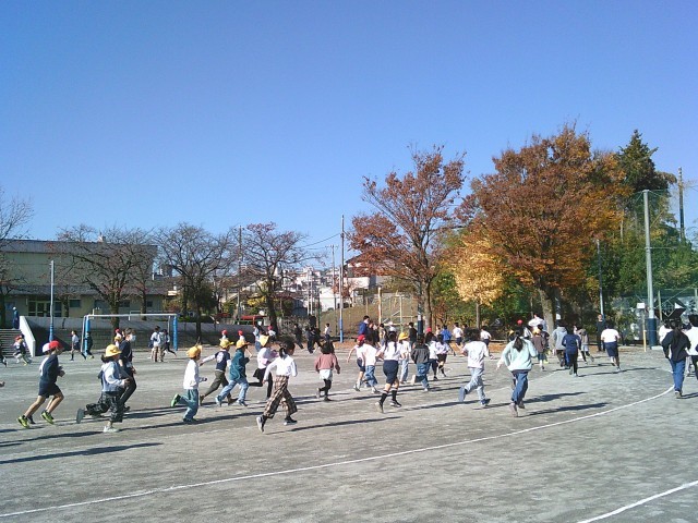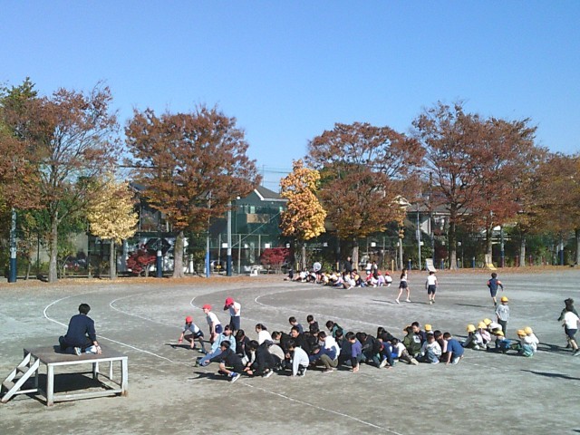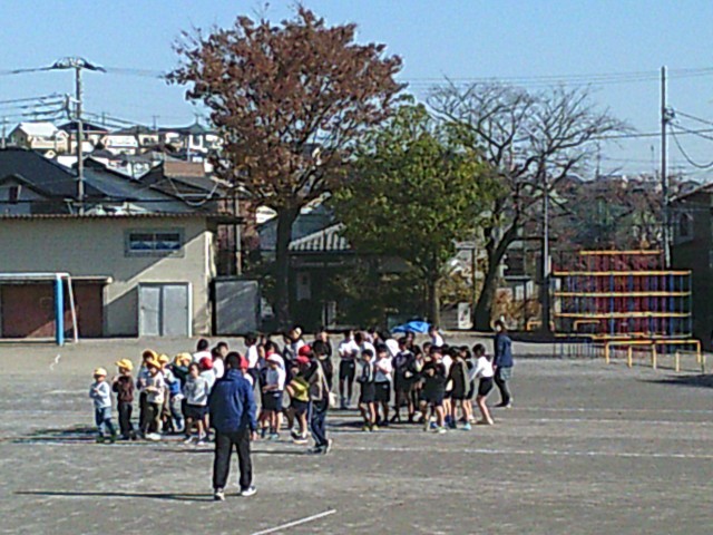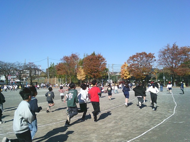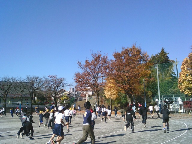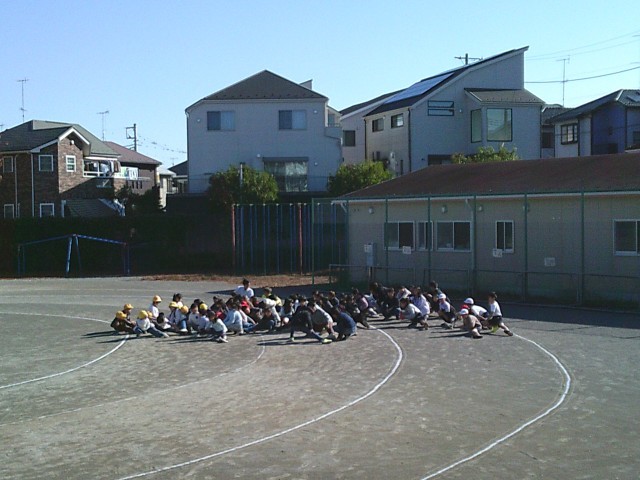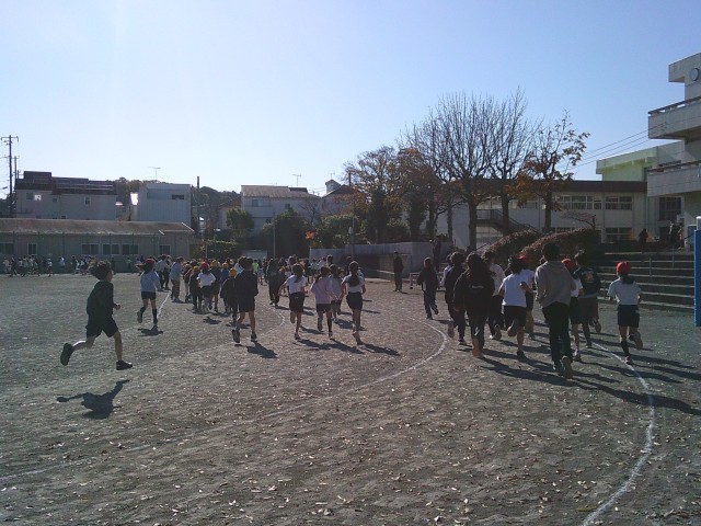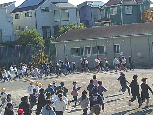 26日(水)から持久走旬間が始まりました。持久走大会を前に、全校児童で校庭を走ります。子どもたちの登校前に先生たちが3つのコースを描きました。中休みに子どもたちが全員校庭に集まり、1組2ヶ所、2組も2ヶ所に分かれて準備運動をしました。その後、先生の合図とともに同じ方向に走り出しました。1・2年生は3分間、3・4年生は4分間、5・6年生は6分間走ります。途中で歩いても大丈夫です。体育の授業でも持久走の練習をします。