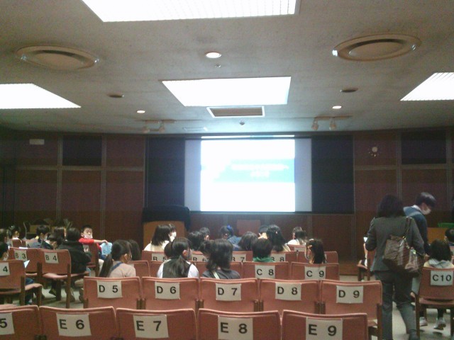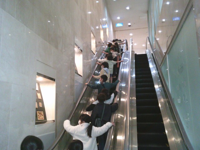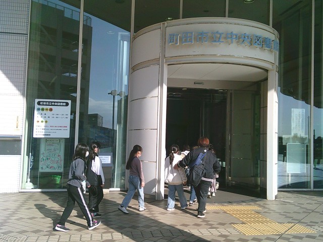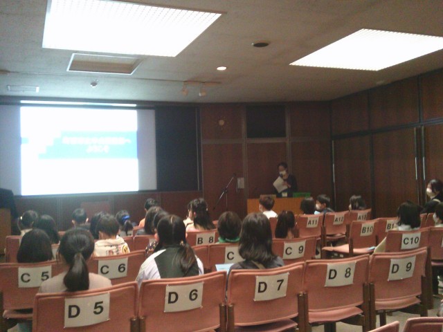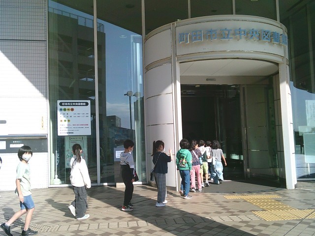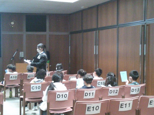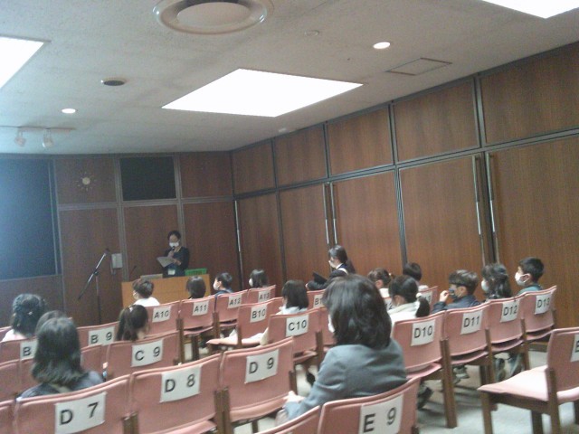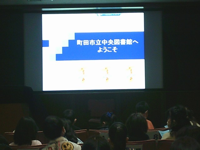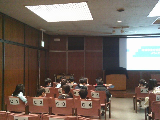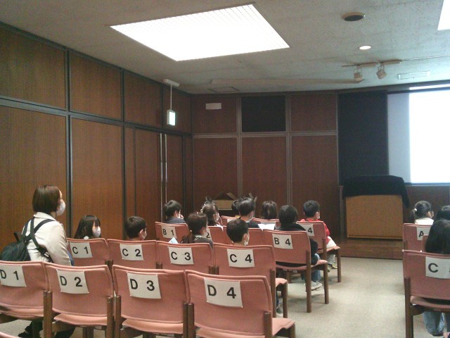 27日(木)午前10時、一般の利用者が先に入館してから、2組、1組の順番で6階のホールまで行きました。長いエスカレーターを上手に乗り、「寄木細工」の展示を見ながらホールに入りました。前方に2組、後方に1組が横長になって座りました。最初に、「図書館ってどんなところなのか」をスライドを見ながら説明していただきました。子どもたちは静かに話を聞くことができました。