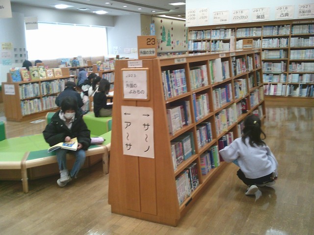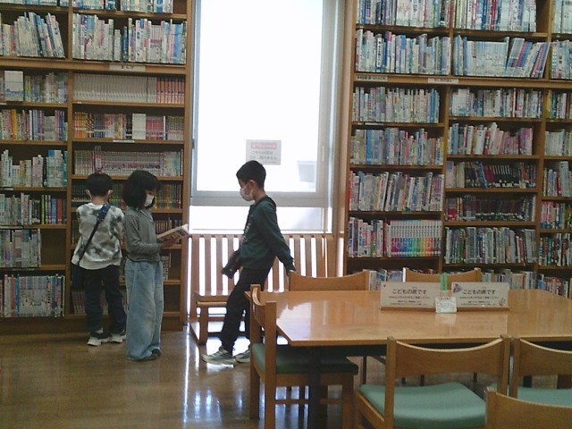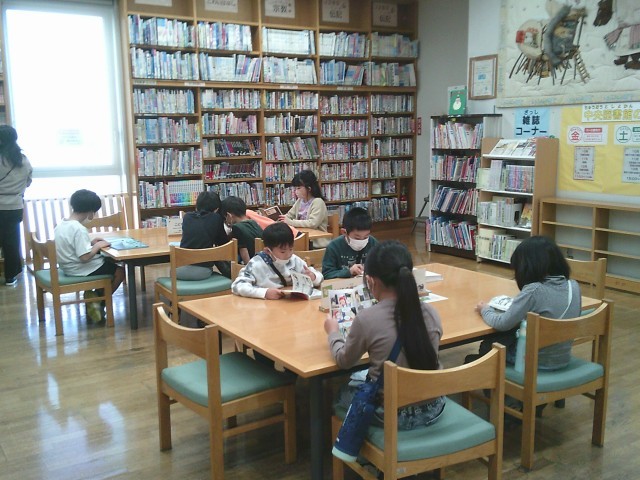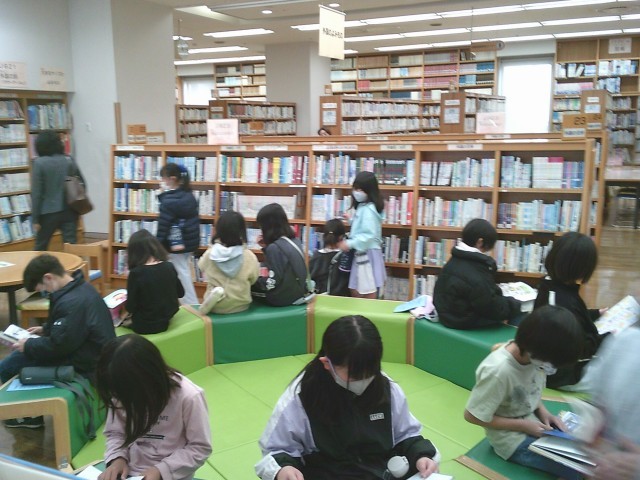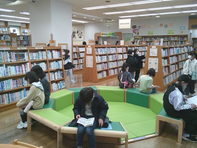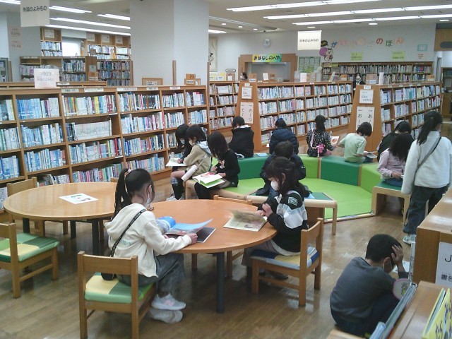 27日(木)午前11時から約20分間、4階児童フロアにて自由に読書をしました。本を自由に手にしたり、分からないことは職員の方に聞いたりしました。椅子やソファに座って、静かに読書をする姿がありました。検索機能付きの機械で実際に本を探す人もいました。