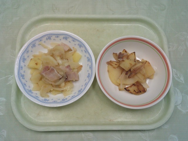 27日(木)午前中、6年生は家庭科の学習で「ジャーマンポテト」の調理実習をしました。1・2時間目は2組、3・4時間目は1組でした。2年生との図書館見学から帰ると校長室に2組さんから「ジャーマンポテト」(写真右側)が届いていました。その後、実習を終えたばかりの1組さんが届けてくれました。(写真左側)どちらの料理も見た目、味付けともにバッチリでとてもおいしかったです。6年生の皆さん、ありがとうございました。