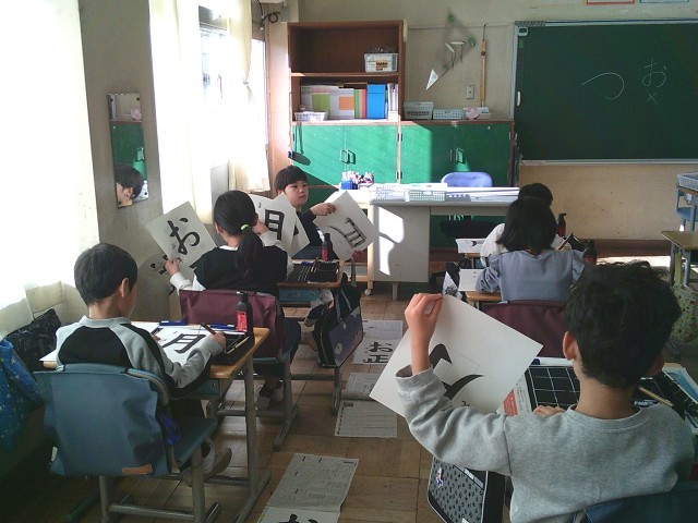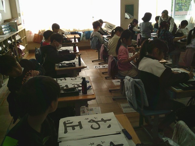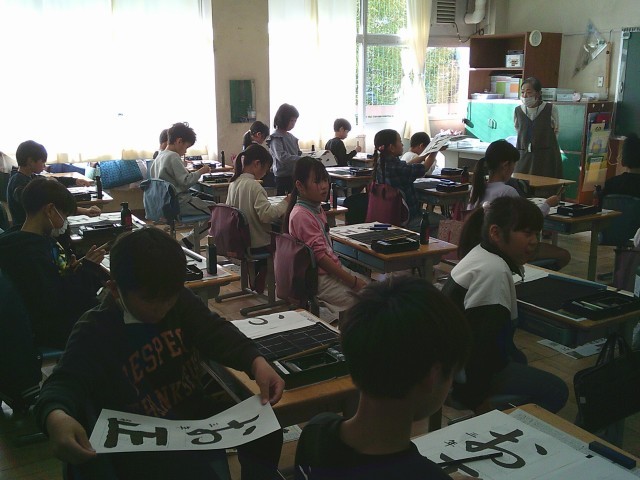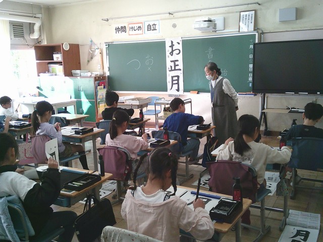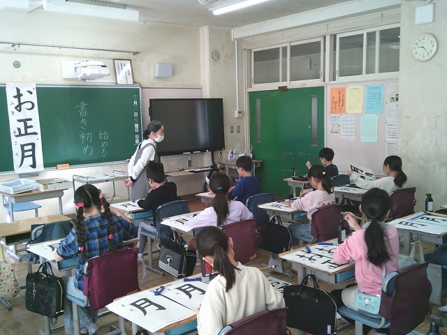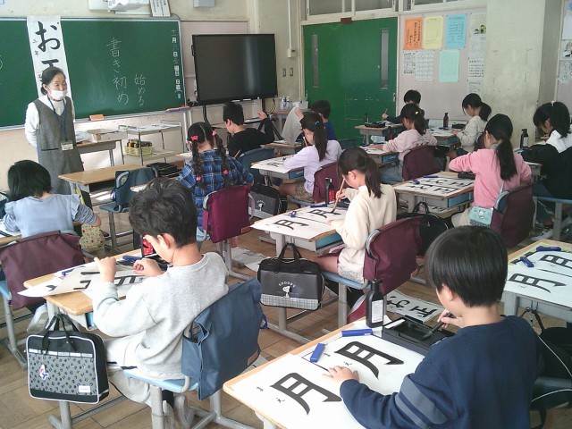 28日(金)1・2時間目、3年2組は書写の時間でした。初めて「書き初め」に取り組みました。書き初め用紙には書かず、印刷されたお手本をなぞったり、半紙を2枚使って「お正月」と書いたりしました。大きく書くことができるように練習をしていました。
