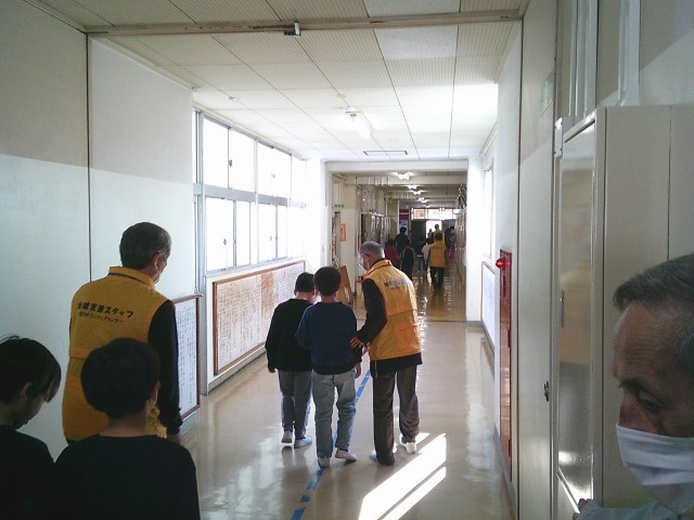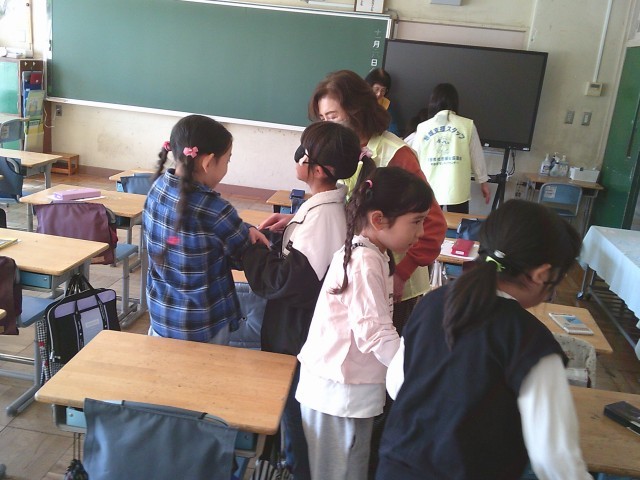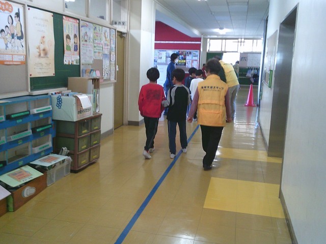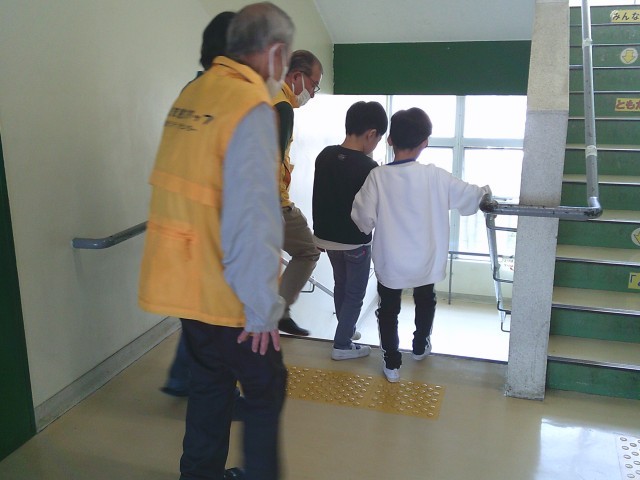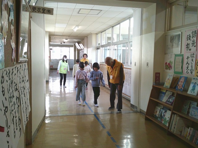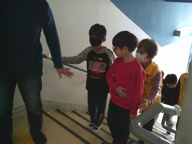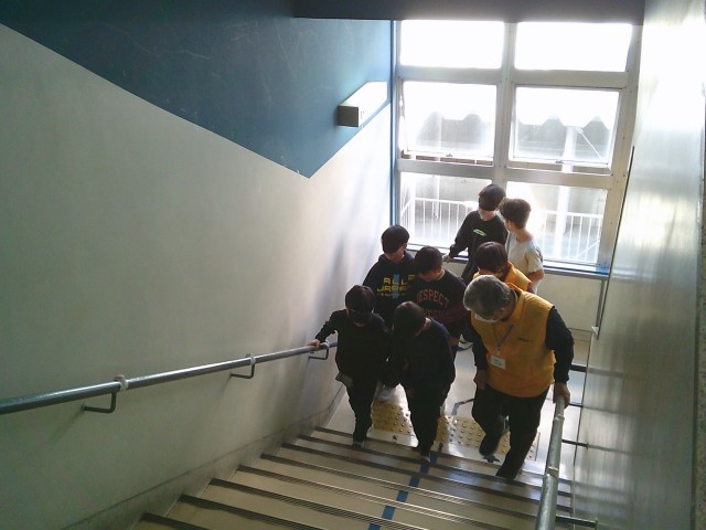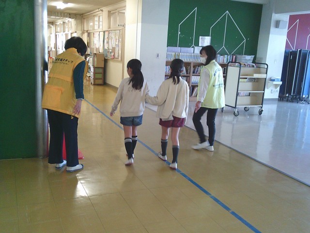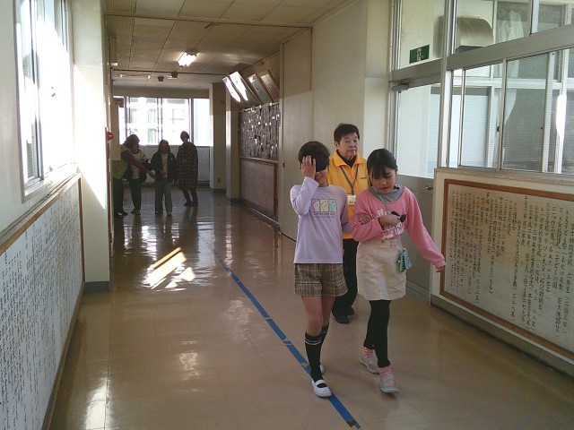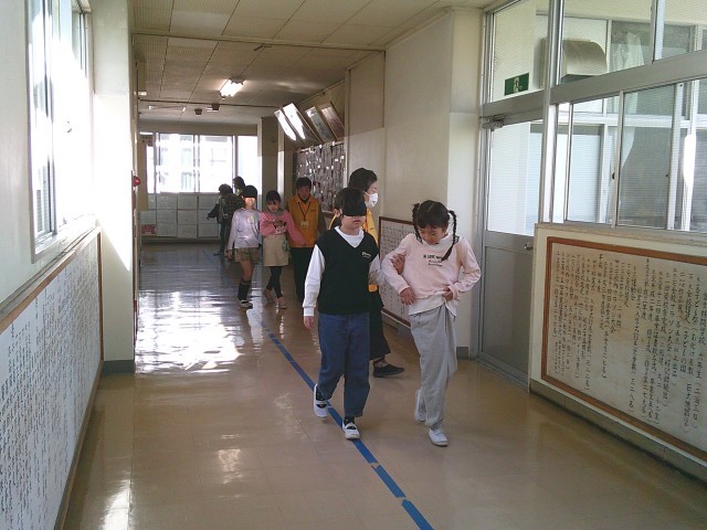 28日(金)4時間目、3年2組はアイマスク体験をしました。総合的な学習の時間「バリアフリーについて知ろう」の取り組みです。アイマスクをつけることで「見えない」ことを実感しました。急に見えなくなるので、不安な気持ちになります。そこで半歩先を行く人が「右に曲がります」と声に出したり、「階段です」と言って手すりを触らせたりしました。また、2階を歩くときは「今、校長室の前です」「職員室の前です」などどこにいるのかを伝えることもしました。本日もボランティアコーディネーターの皆さんにご協力をいただきました。ありがとうございました。