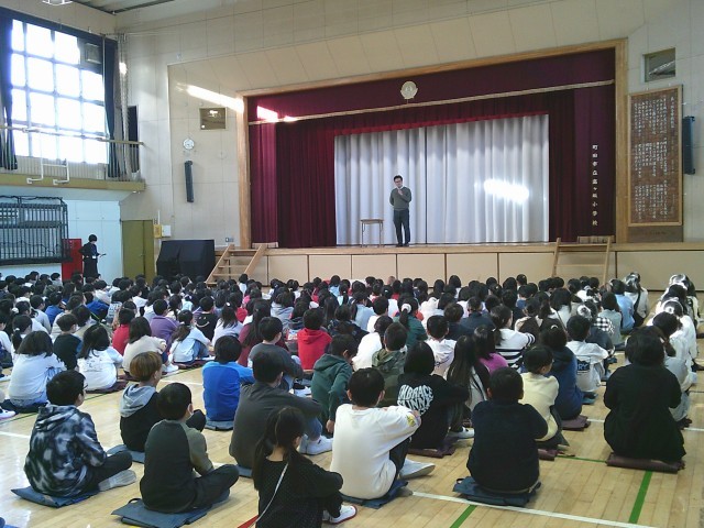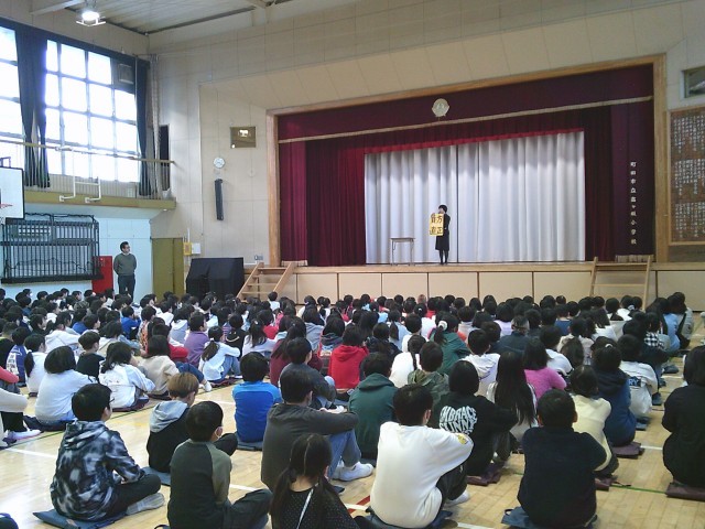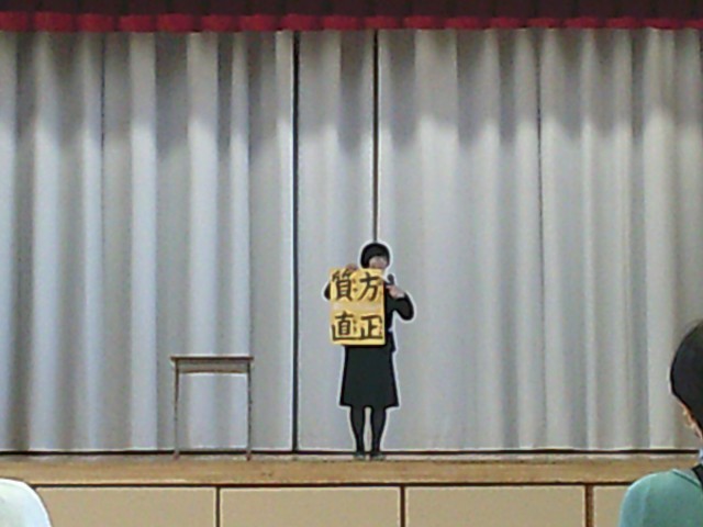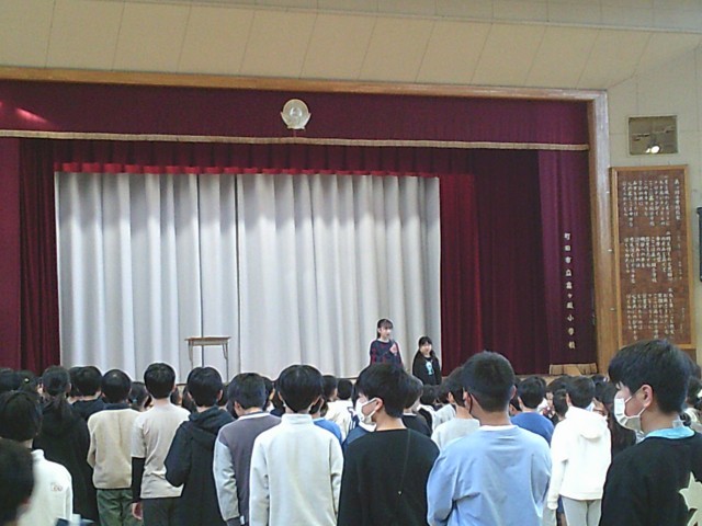 12月1日(月)午前8時20分から体育館で朝会を行いました。本校の朝会は、第1週は体育館、第3週はオンラインで実施しています。最初は、企画委員会の5年生と6年生による挨拶です。次は、校長先生の話でした。「方正質直」から「正直」の言葉ができたこと、嘘をつかずに勇気を出して正直に話すことが大事であることを話しました。最後は、看護当番の先生から話がありました。