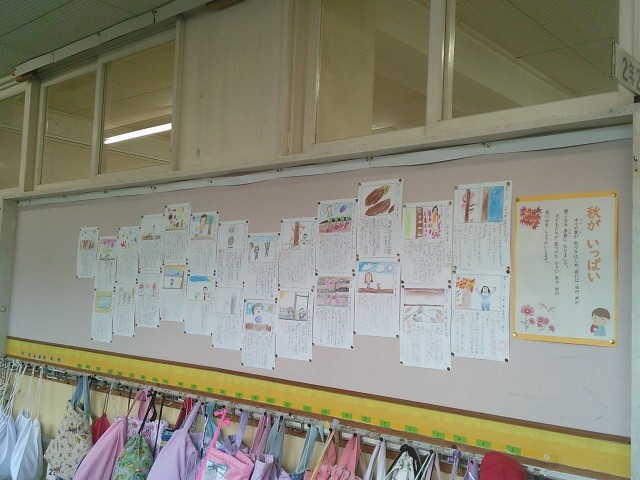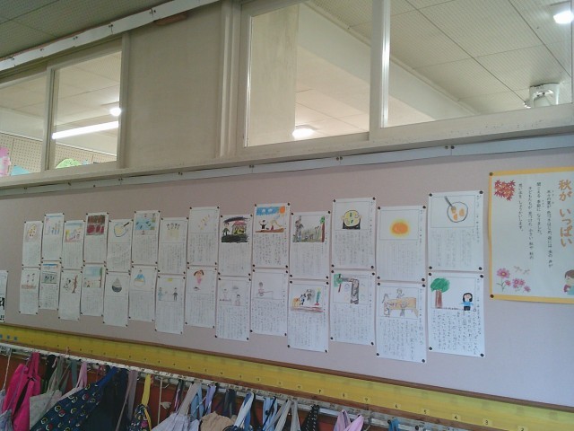 2年生の廊下の写真です。国語の時間に取り組んだ「秋が いっぱい」カードが登場しました。子どもたちが見付けた秋を文章と絵とで表現しています。