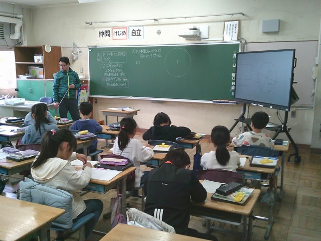 2日(火)2時間目、3年生は算数の時間でした。今回は、「円を使って、二等辺三角形や正三角形をかこう」をめあてに取り組みました。コンパスや定規が必要になります。子どもたちは半径3cmの円を描いてから、円の中に課題の三角形をどのようにかけばよいのかを考えました。