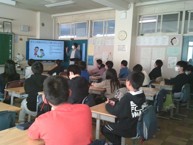 4日(木)の高ヶ坂タイムは、全学級で「安全指導」を行いました。生活指導部で作成したスライドをもとに、担任が指導をします。今月は、掃除の時に注意すること、トラック等の内輪差に気を付けることなどを話しました。写真は6年生から3年生の様子です。