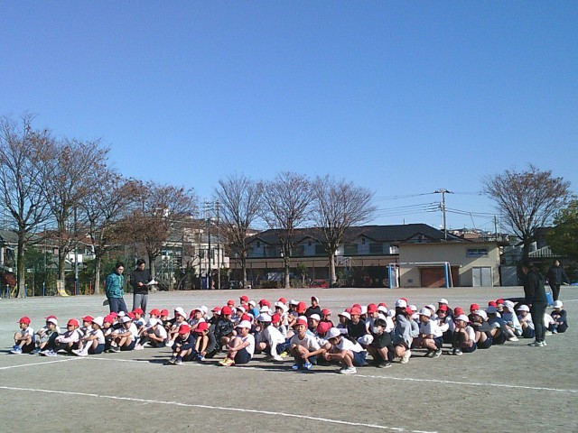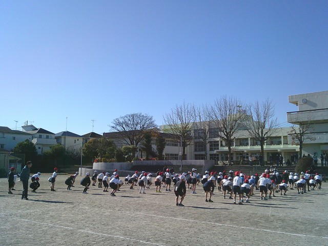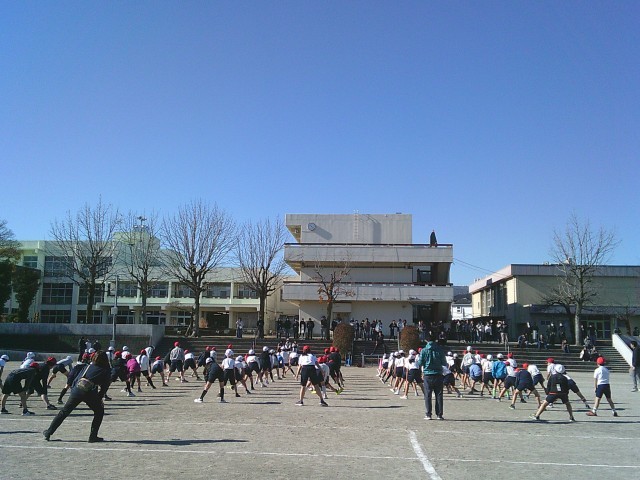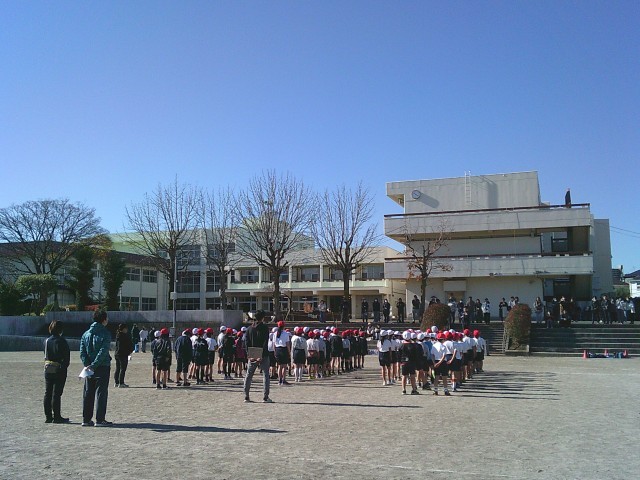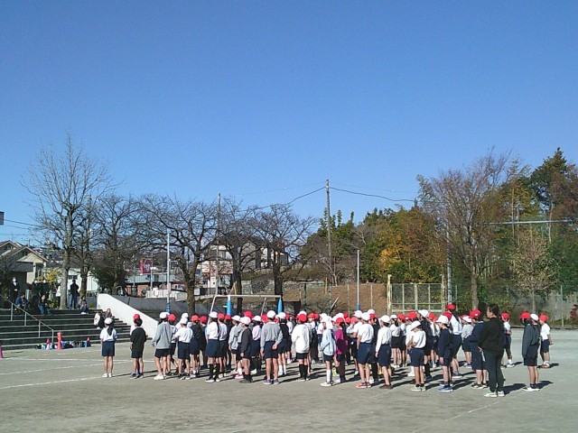 5日(金)午前10時20分から、3年生と4年生による持久走大会を開催しました。校庭に学年別学級別に整列してから、「始めの会」をしました。司会進行は、体育的行事担当の先生が務めました。