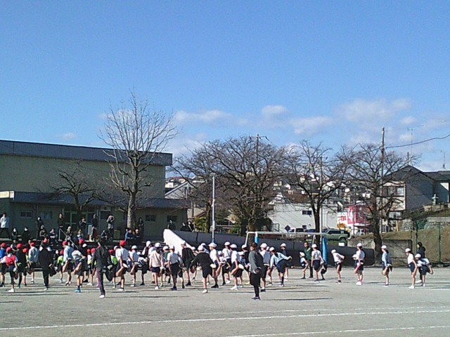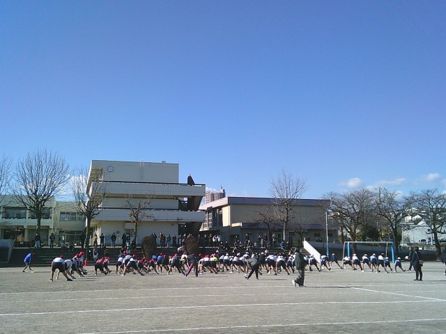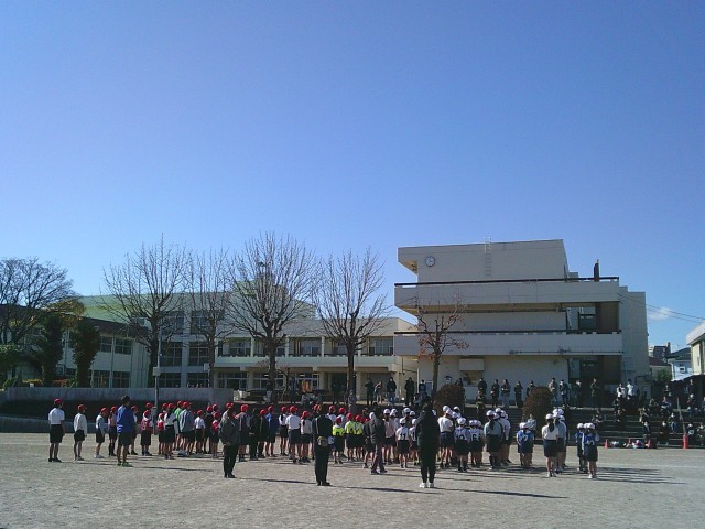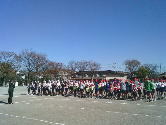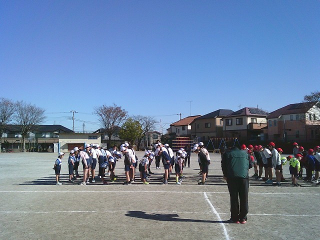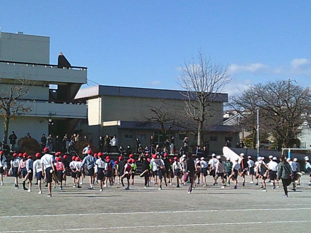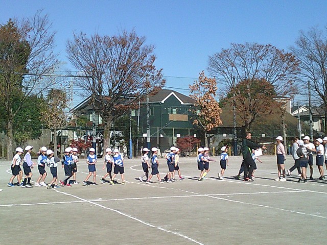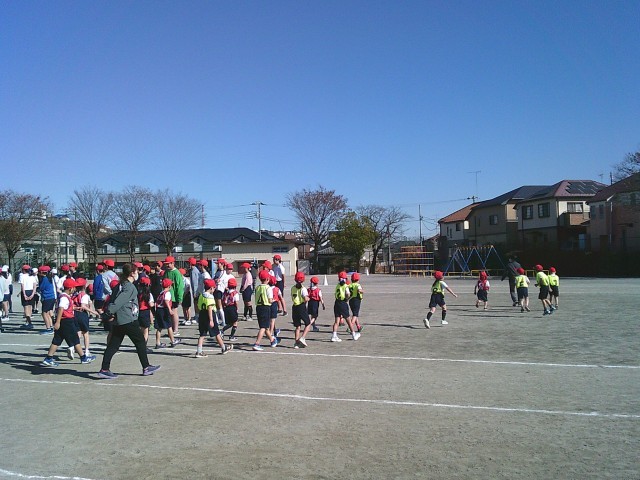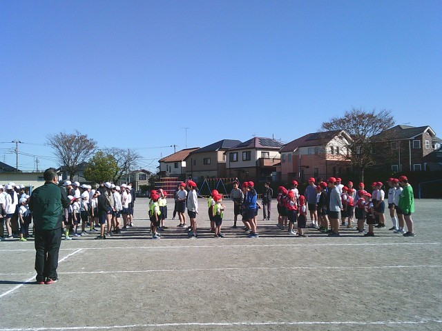 5日(金)午前11時10分から1年生と6年生による持久走大会を開催しました。6年生が各学級4列になって並び、その間にビブスを着た1年生が入ってペア作りをしました。最初に向かい合って「よろしくお願いします。」と挨拶をしました。次に「始めの会」をして、準備運動へと進みました。