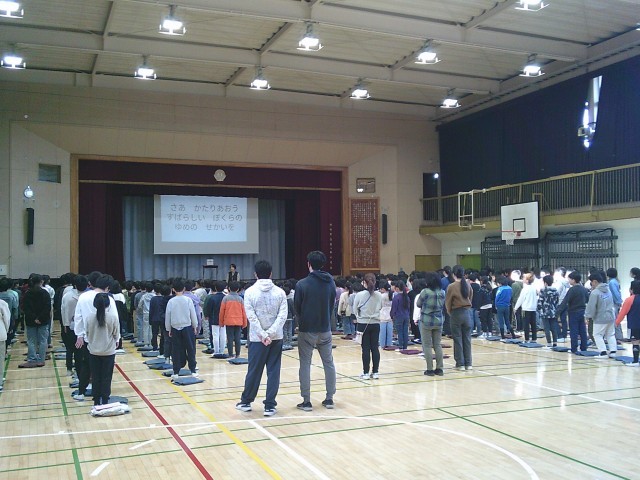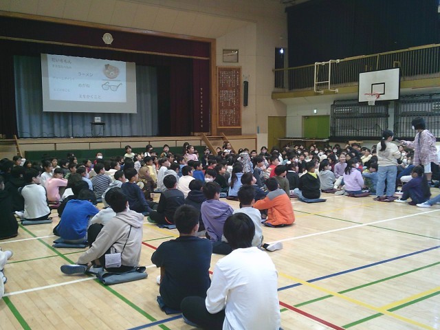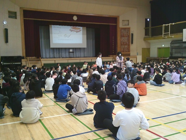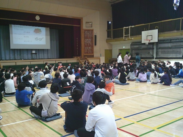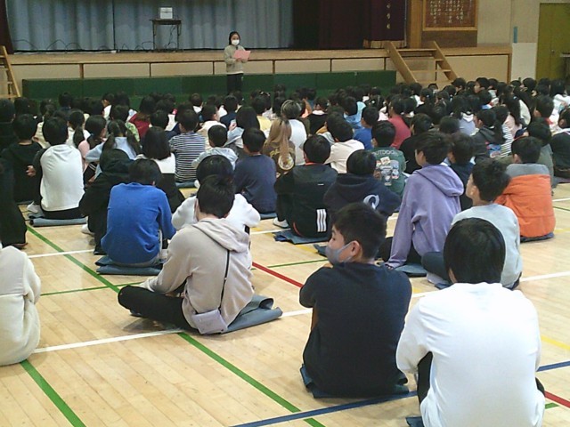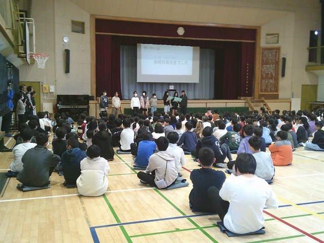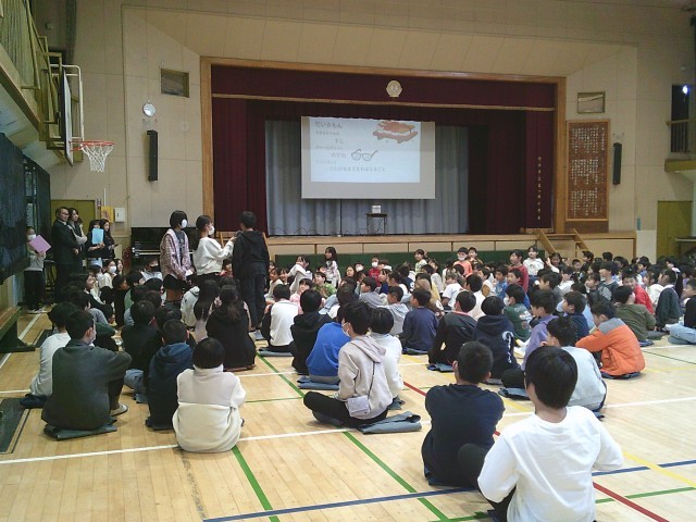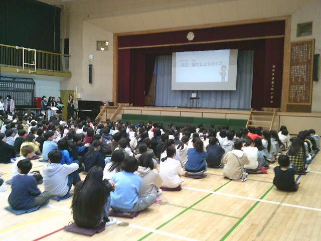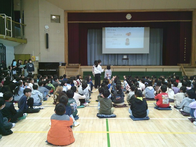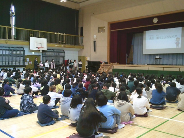 8日(月)朝、体育館で集会をしました。今回は「先生 誰でしょうクイズ」をしました。集会委員は8人の先生にインタビューをして、一人に付き3つのヒントを用意しました。子どもたちはヒントをもとに誰なのかを考えました。クイズ集会後、図書委員会委員長から「読書旬間」のお知らせがありました。最後に全員で「夢の世界を」を歌って2学期の集会を終えました。