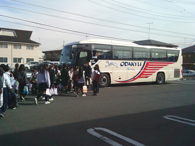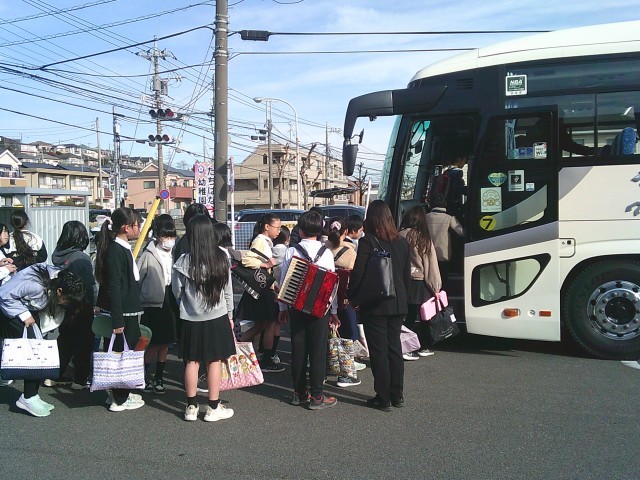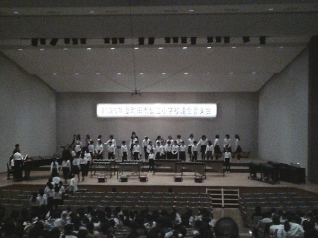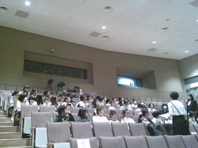10日(水)5年生は市が用意したバス1台に乗り、午後1時30分に市民ホールに到着しました。本校が1番に着きました。午後2時から連合音楽会が始まり、本校は7校中の最後に演奏しました。座席からステージに向かう表情は少し緊張をしていましたが、これまで学習発表会で2回発表しているのを強みにしてステージに上がりました。このあと、照明が明るくなり、子どもたちは素晴らしい演奏を披露しました。