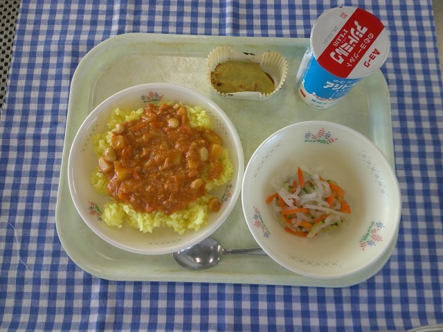 12日(金)の献立は、チリビーンズライス、やさいピクルス、スイートポテト、のむヨーグルトです。