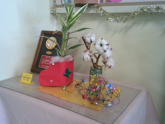 職員用玄関にある生け花が新しくなりました。花器は空き缶に飾り付けしたものですが、すてきです。