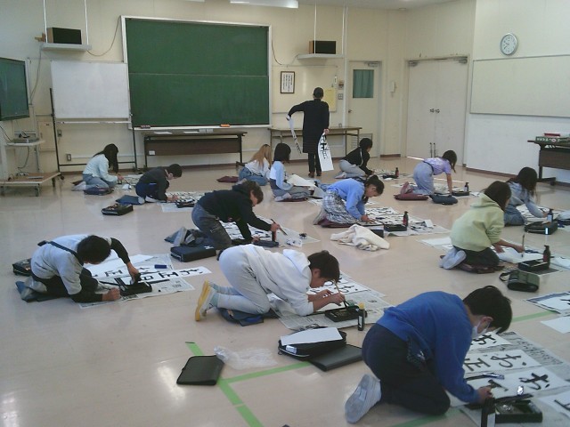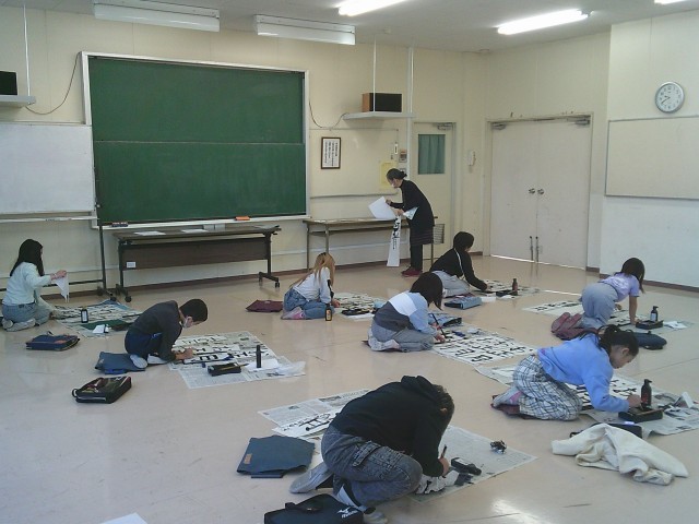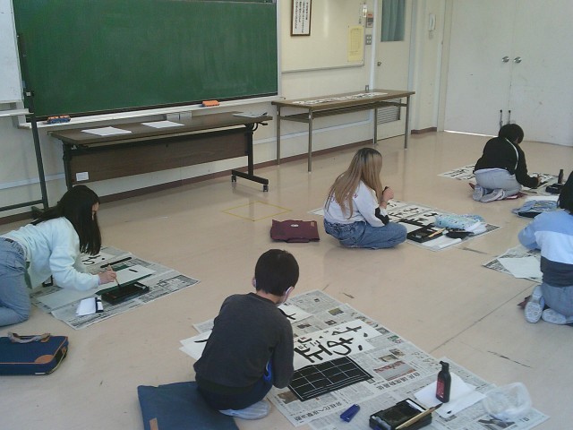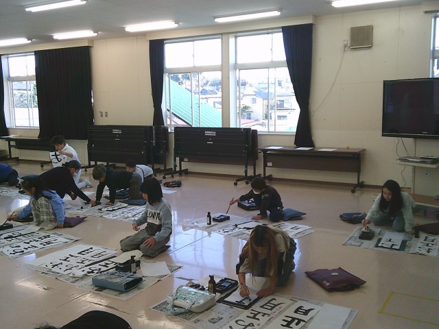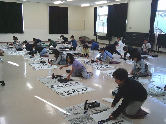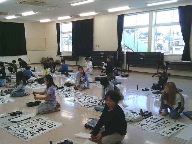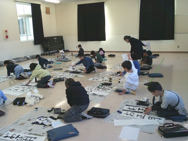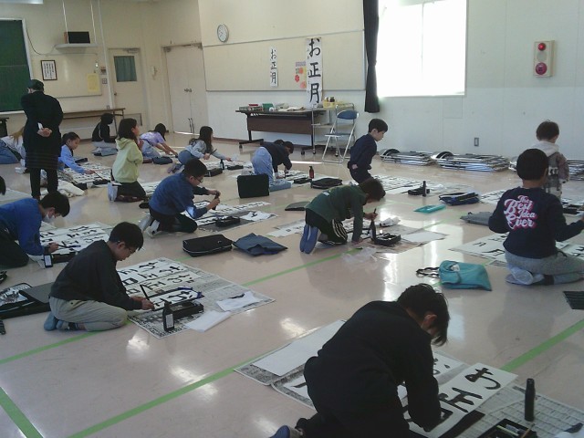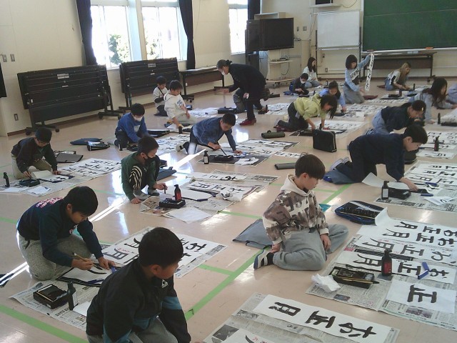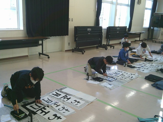 12日(金)1・2時間目、3年1組は書写の時間でした。書き初めの練習を視聴覚室で行いました。新聞紙を敷きその上に習字道具を置いて準備をしました。前半は通常の半紙に書いて練習し、後半から長い書き初め用紙で練習しました。布製の下敷きをその都度動かす必要があるので、子どもたちは気を付けながら書いていました。