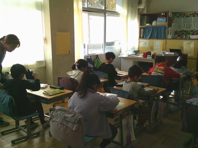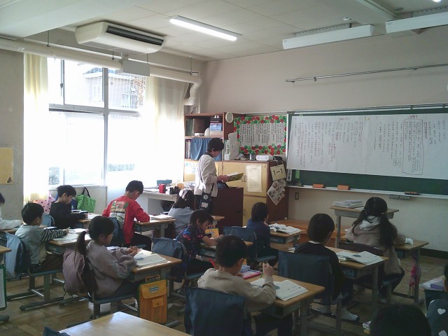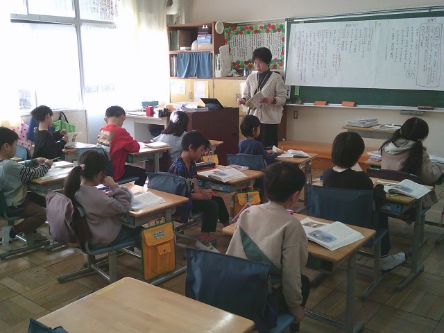 12日(金)2時間目、1年1組は国語の時間でした。最初に新しい漢字の練習をしました。今回は「音」です。次に、「たぬきの糸車」の学習をしました。「好きな場面を伝えよう」がこの時間のめあてでした。担任の先生がゆっくり歩きながら範読し、子どもたちは各場面の中で好きなところに黄緑色の線を引きました。