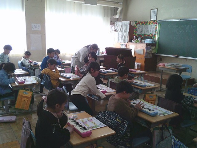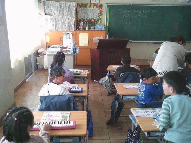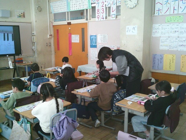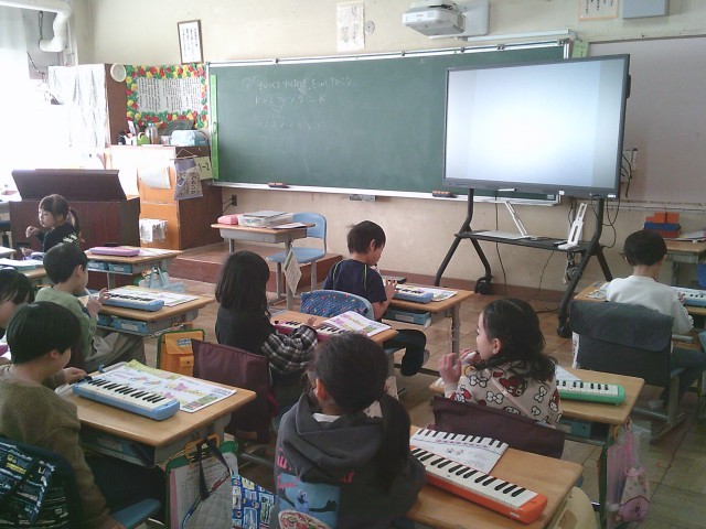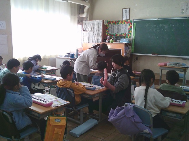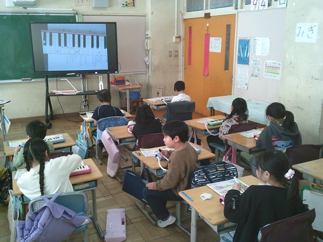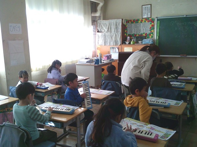 12日(金)2時間目、1年2組は音楽の時間でした。最初に今月の歌「夢の世界を」を歌いました。サビの部分を伸びやかに歌っていました。次に鍵盤ハーモニカを出して「とんねるくぐり」の曲を練習しました。この曲では、指くぐり、指またぎの技法が出てきます。子どもたちは出来るようになるまで何回も練習をしていました。