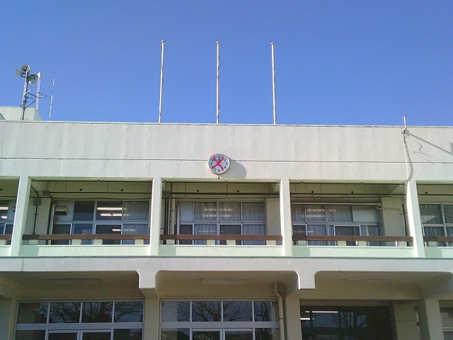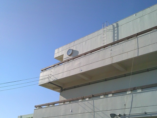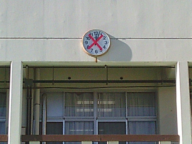 本校の校舎外壁に大きな時計が2つ設置されています。一つは上校庭用、もう一つは下校庭用です。今回、職員室の外側についている上校庭用の時計が正しい時刻を示さなくなりました。そこで、機械を止め、大きなバッテンが付けられました。下校庭用の時計は正常に動いています。