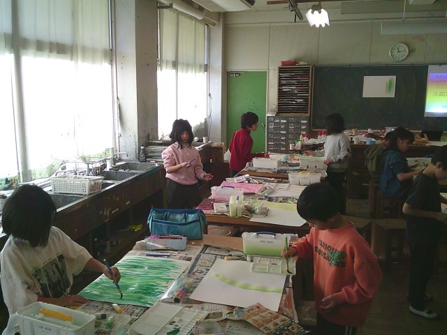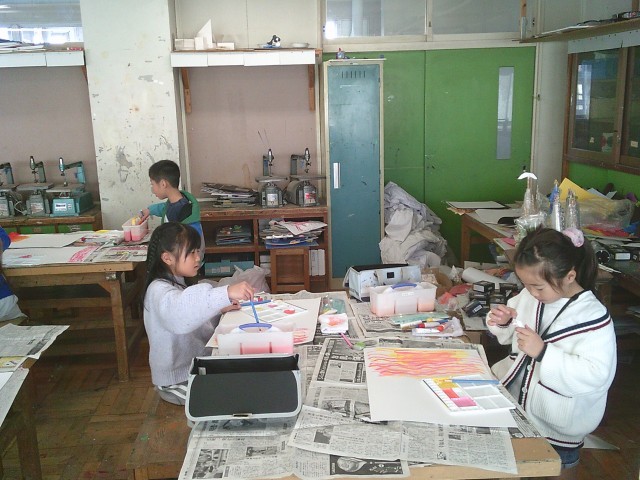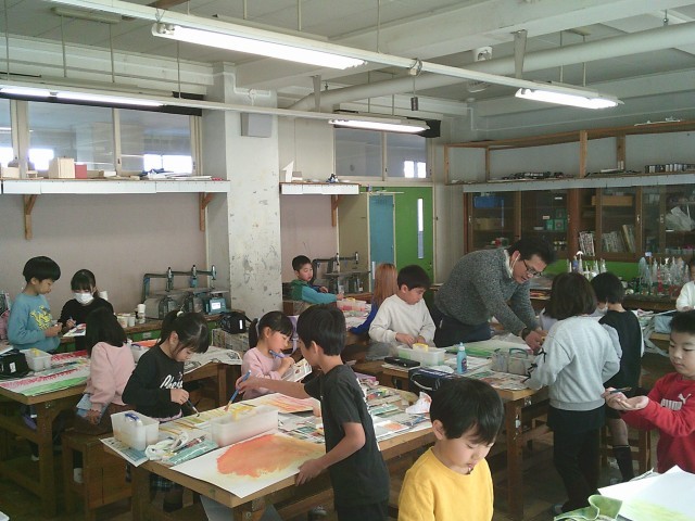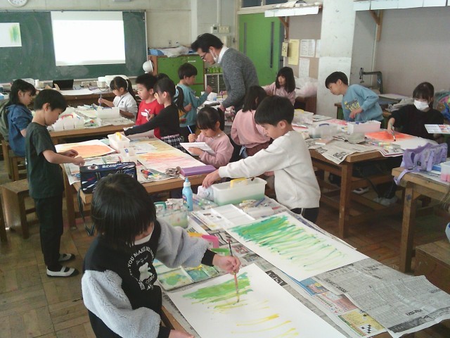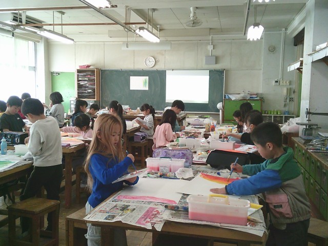 12日(金)3・4時間目、2年2組は図画工作の時間でした。「えのぐでかこう」に取り組んでいます。絵の具の重ね塗り技法を使って画用紙に色を付けました。子どもたちは筆の動かし方を変えるだけで色味が変わることに気付き、楽しんでいました。
