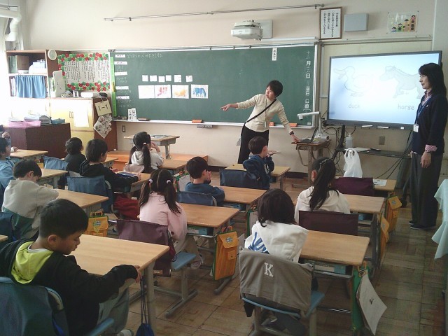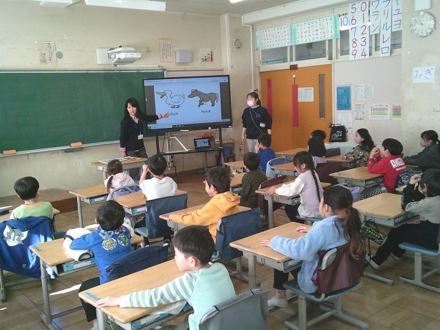 15日(月)、本校にMeps(Machida English Promotion Staff:英語授業指導員)の先生が来校し、1年生と2年生が外国語活動をしました。1年1組は2時間目、1年2組は3時間目に行いました。今回は、「動物の言い方を知ろう」をめあてに学習しました。イヌ、ネコ、カエル、ウマ、アヒル、クマなどが登場し、担任の先生が授業を進め、Mepsが発音を担当しました。子どもたちは、元気よく発音していました。