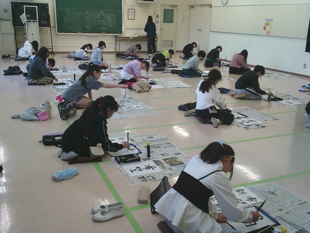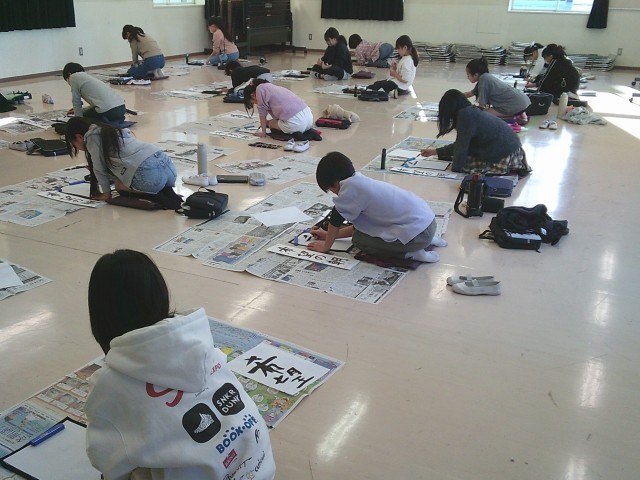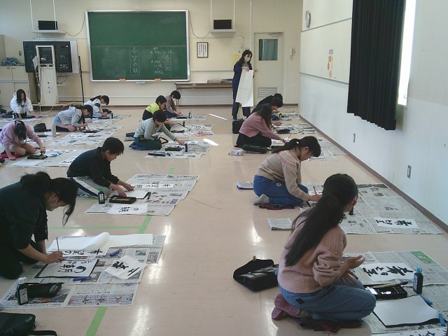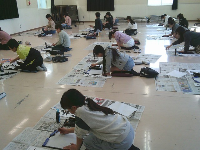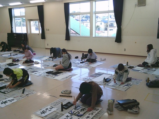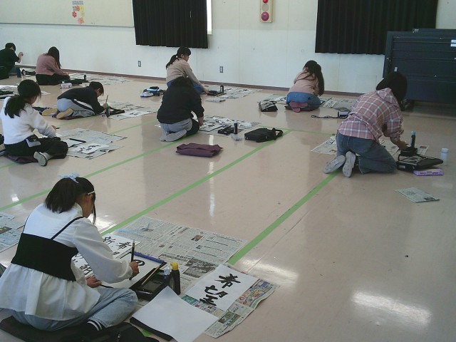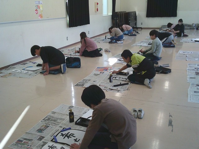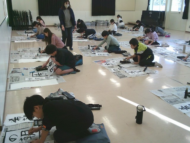 16日(火)1・2時間目、5年2組は書写の時間でした。視聴覚室で書き初めの練習をしました。今年は「希望の朝」と書きます。昨年は「元気な子」でしたから、文字数は同じですが、漢字の画数が多くなりました。子どもたちは、間隔を取って習字道具を置き、半紙に二文字ずつ書く練習から始めました。1組は18日(木)に書き初めの練習をする予定です。