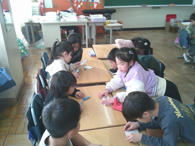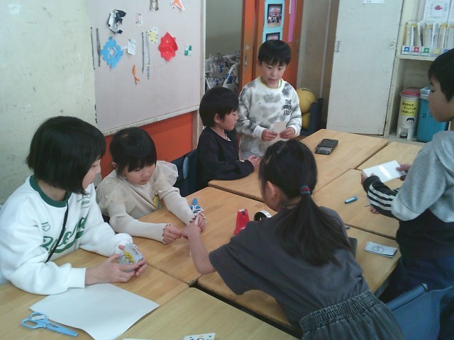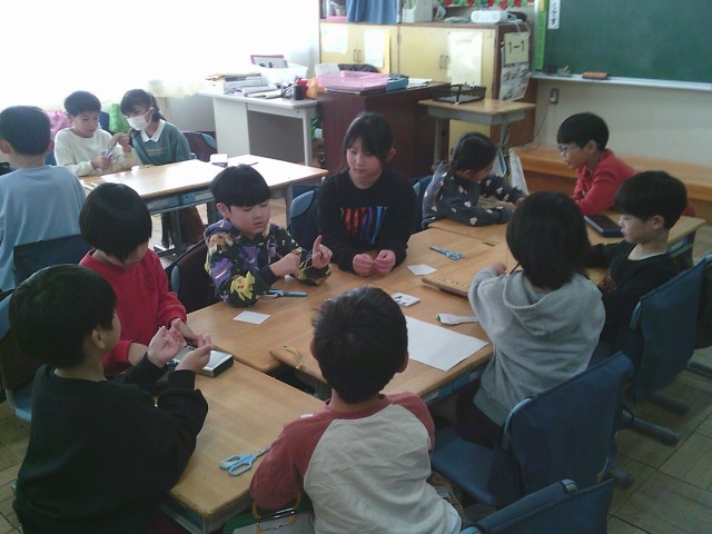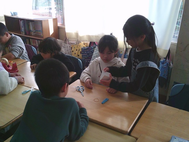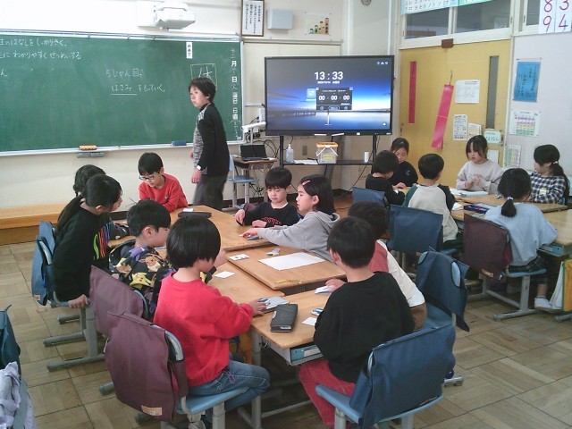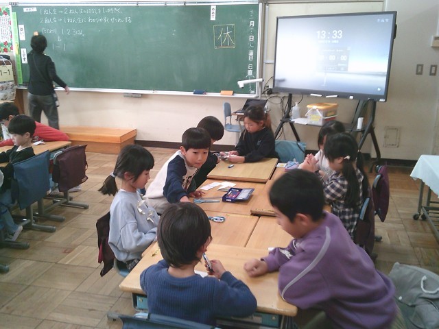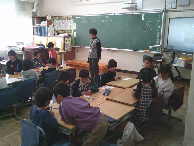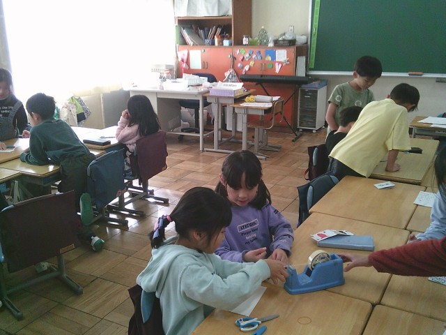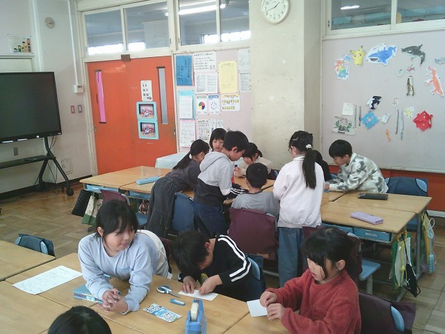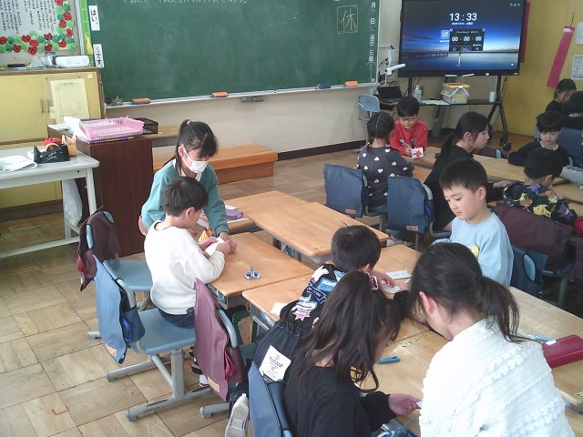 16日(火)5時間目、2年1組は生活の時間でした。「1年生とあそぼう!」の本番です。パッチンガエルの作り方を同じたてわり班の1年生に教えて、一緒に楽しむことがめあてです。半数は1年1組で、もう半数は2年1組で活動ました。2年生はパッチンガエルの作り方を順番に教え、1年生は教えてもらったとおりに作っていきました。優しく教える2年生の姿がとてもすてきでした。