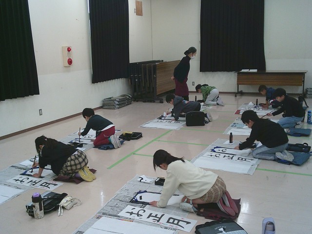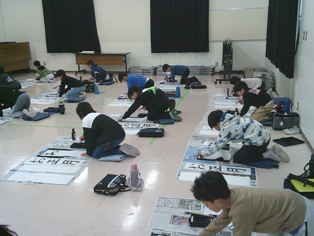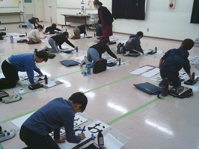 19日(金)1・2時間目、3年2組は書写の時間でした。視聴覚室において書き初めの練習をしました。新聞紙を床に敷き詰め、その上で書道セットを広げました。前半は半紙で二文字ずつ書いて練習しました。後半は書き初め用紙を使って「お正月」と書きました。