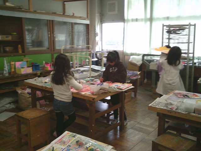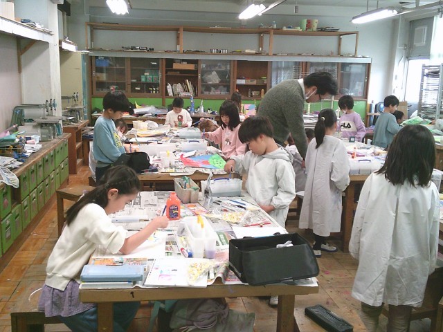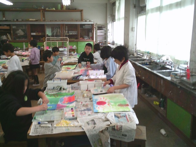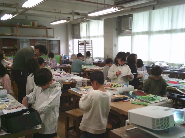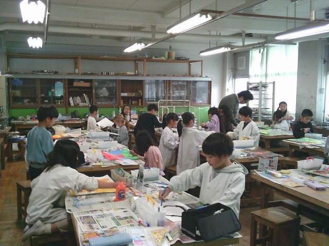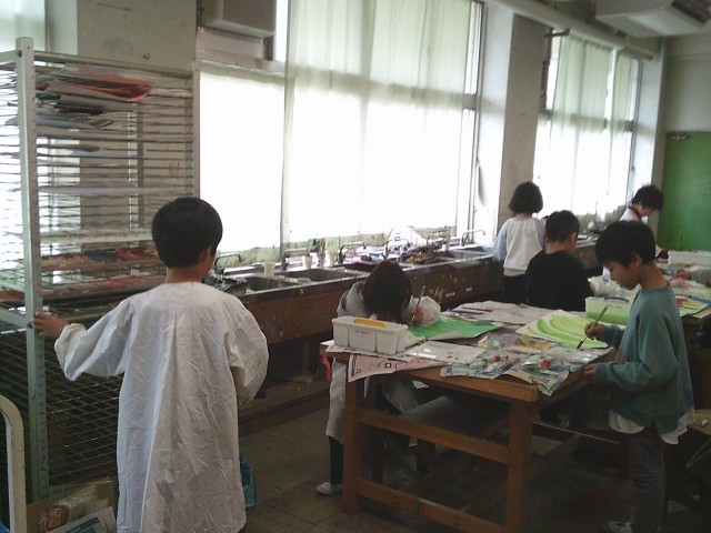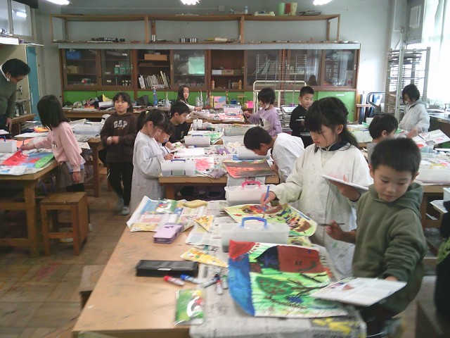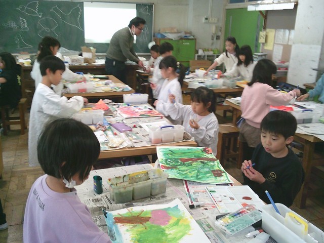 19日(金)3・4時間目、2年2組は図画工作の時間でした。「えのぐで かこう」の仕上げに取り組んでいました。森に見立てた重ね塗りの上に、動物などの絵を描いていました。服が汚れないように、古い白衣を着て作業をする人もいました。