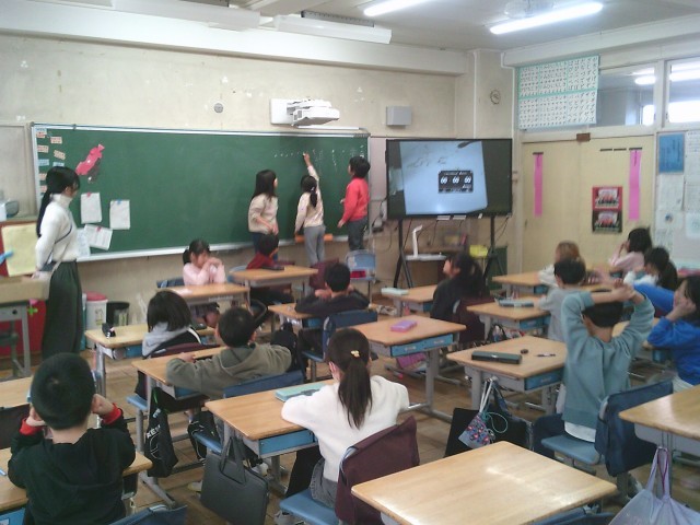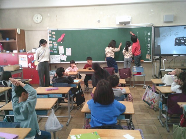 22日(月)4時間目、2年2組は生活の時間でした。「2学期で楽しかったこと」をみんなで振り返っていました。司会者と書記が前に出て、振り返りの話し合いを進めていました。子どもたちからは「こどもまつり」「サツマイモ掘り」「どんぐり拾い」「図書館見学」「スイミー」などたくさんの楽しかったことが出ていました。