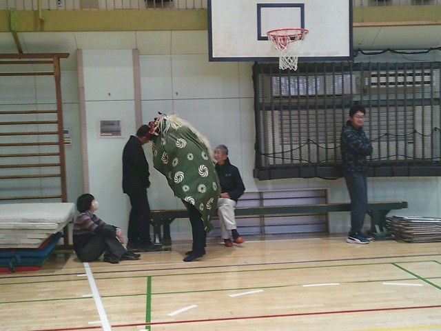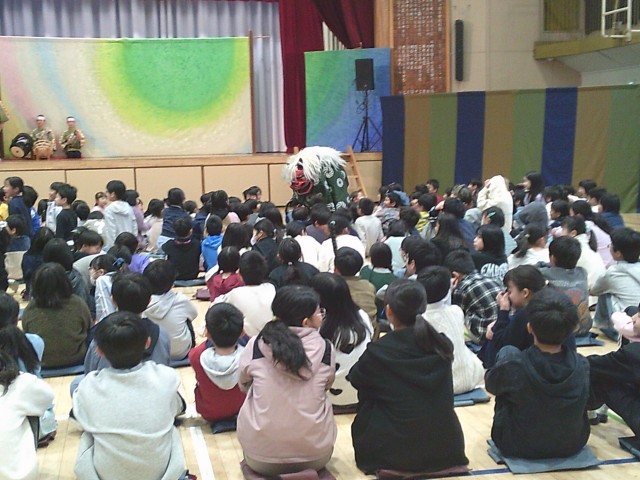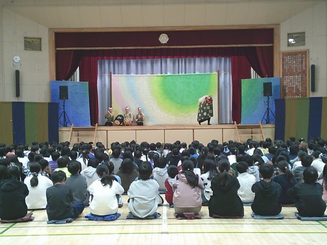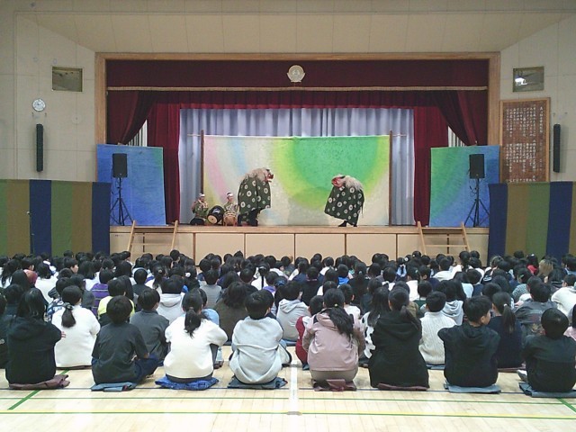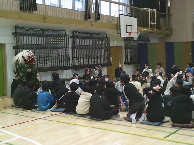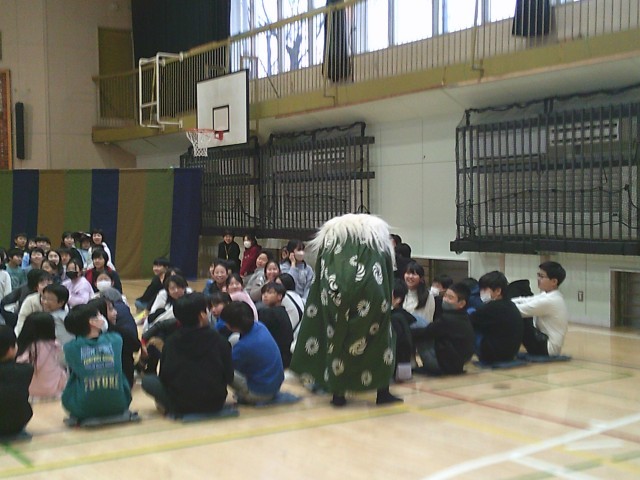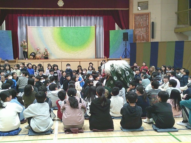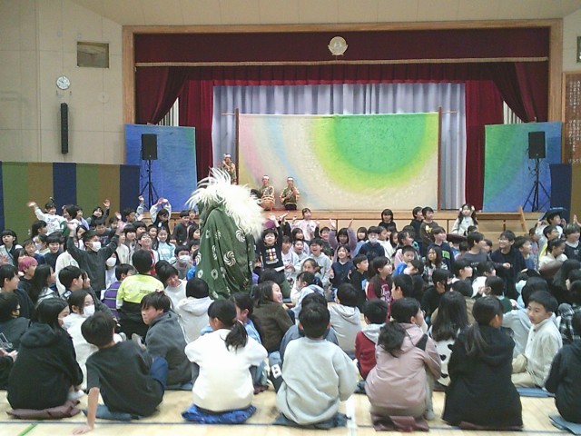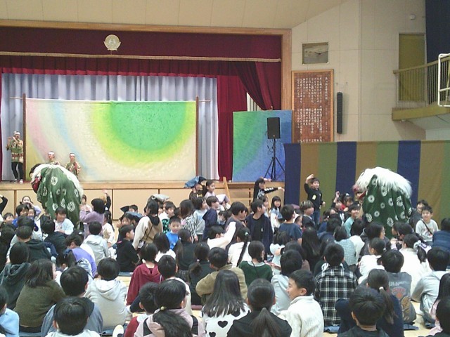 24日(水)3・4時間目、全学年の子どもたちが体育館に集合し、荒馬座の公演を観ました。2つ目の演目は「獅子舞」でした。「獅子に頭を噛まれると幸せになる」という説明を聞いた子どもたちは、お獅子がステージからいつ下りてくるのかわくわくしている様子でした。怖がるよりも手を挙げて「来て来て」と呼んでいました。「お獅子に頭を噛まれなかった人の分も入れて、会場の三方向を噛んだから大丈夫です。」のお話にホッとしている子もいました。