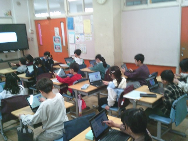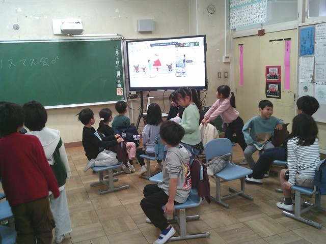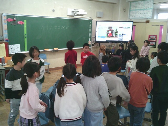 25日(木)4時間目の2年生の様子です。1組は、Canvaを使って年賀状を作っていました。素材が豊富なため、子どもたちは何枚も作って楽しんでいました。2組は、クリスマス会と称してゲームをしていました。写真は「あわてんぼうのサンタクロース」の曲に合わせて「椅子取りゲーム」をしているところです。
