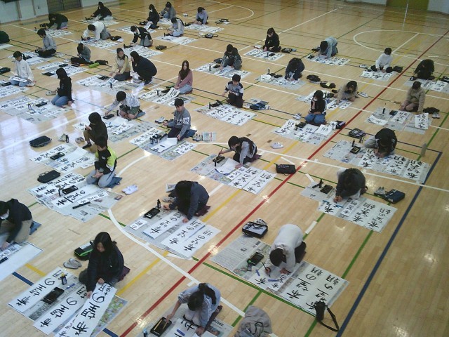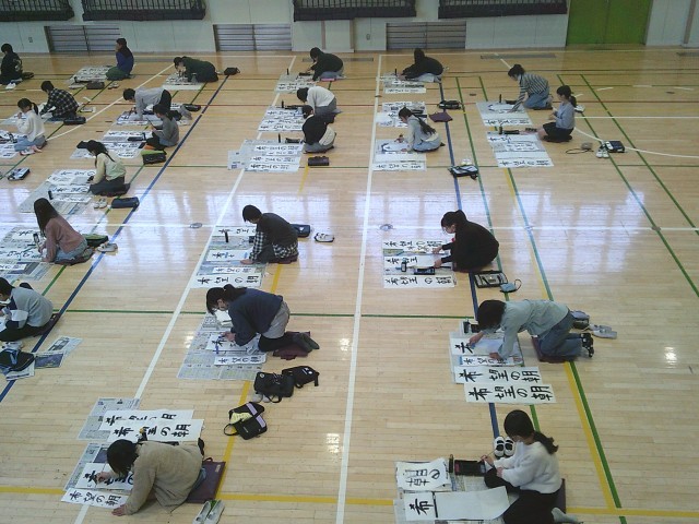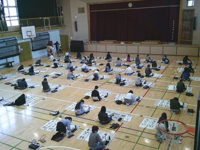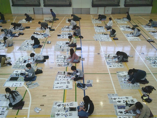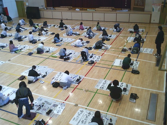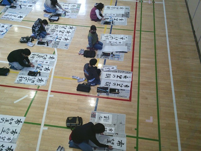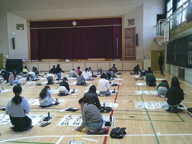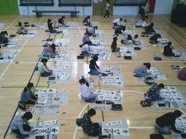 13日(火)1・2時間目、5年生は体育館で書き初めを行いました。「六段の調べ」が静かに流れる中、子どもたちは集中して「希望の朝」と筆を運んでいました。
