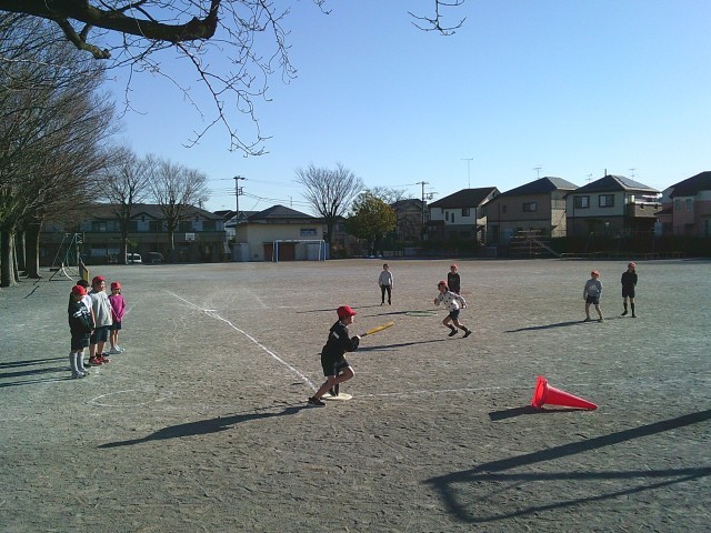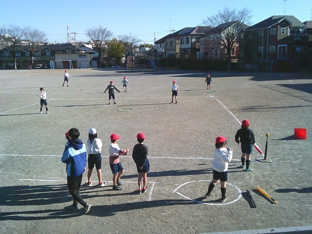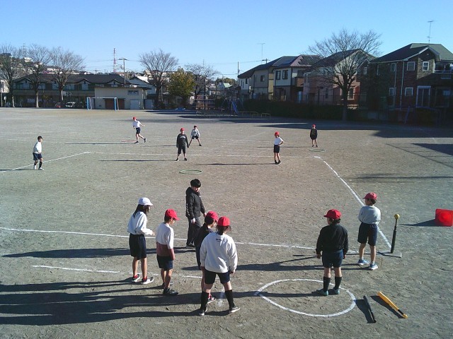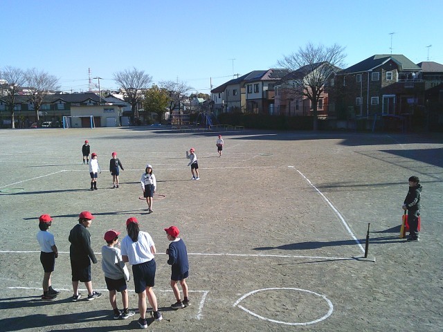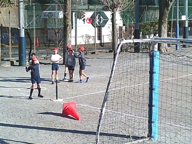 14日(水)1時間目、4年1組は体育の時間でした。「ティーボール」のゲームをしました。道路側と学童側に、2チームずつ分かれてゲームをしました。ティーボールはボールを置いたまま打ちます。バットは三角コーンの中に入れる約束です。子どもたちは同じチームの友達に声援を送ったり、ボールをすぐにキャッチしようと声を掛け合ったりしていました。