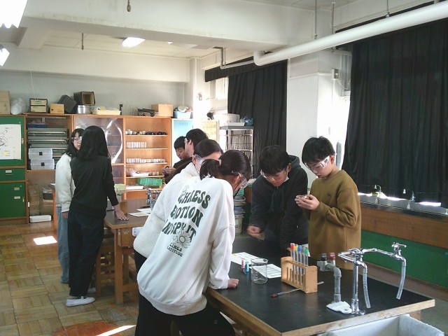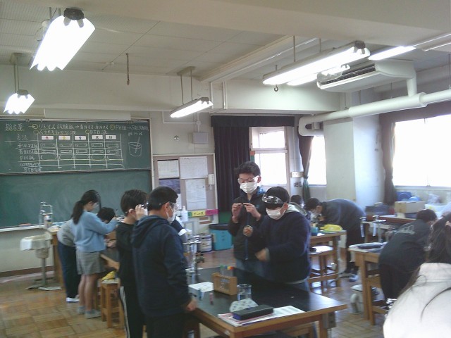 14日(水)1・2時間目、6年2組は理科の時間でした。「水溶液」の学習です。無色透明の液体5種類をリトマス試験紙、PH紙、ムラサキキャベツ液、BTB溶液にそれぞれ付けて反応をみました。子どもたちは安全のためにメガネをかけて実験をしました。