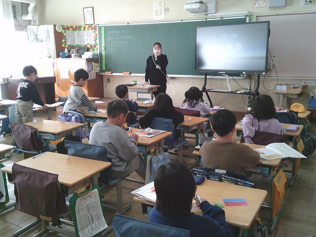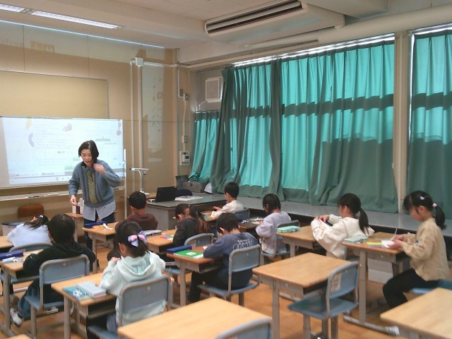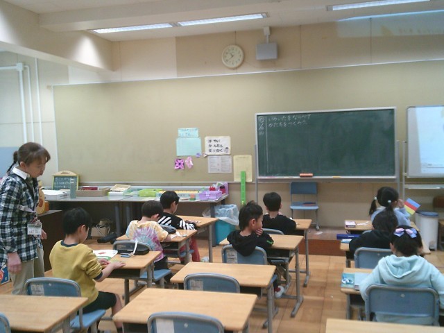 14日(水)3時間目、1年生は算数の時間でした。「かたち」の学習です。はじめに、教科書の後ろにある紙製の「色板」を切り離す作業をしました。色板は一つが三角の形をしています。子どもたちはミシン線に沿って切り取ったり、はさみで切ったりしていました。
