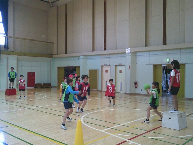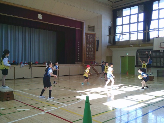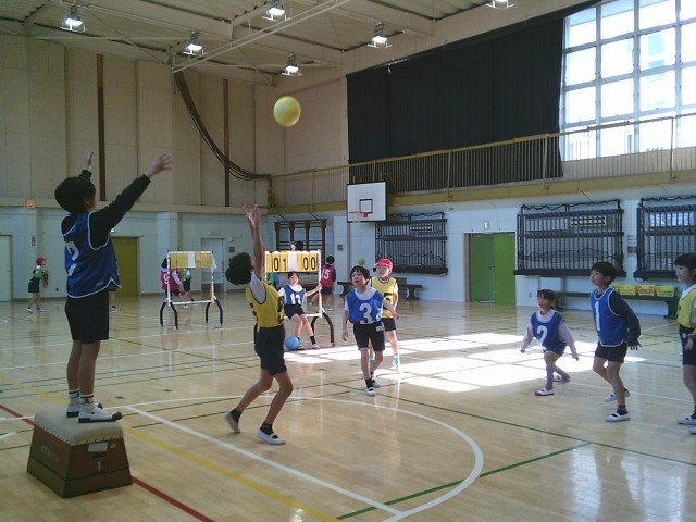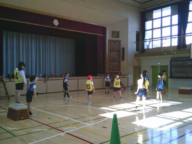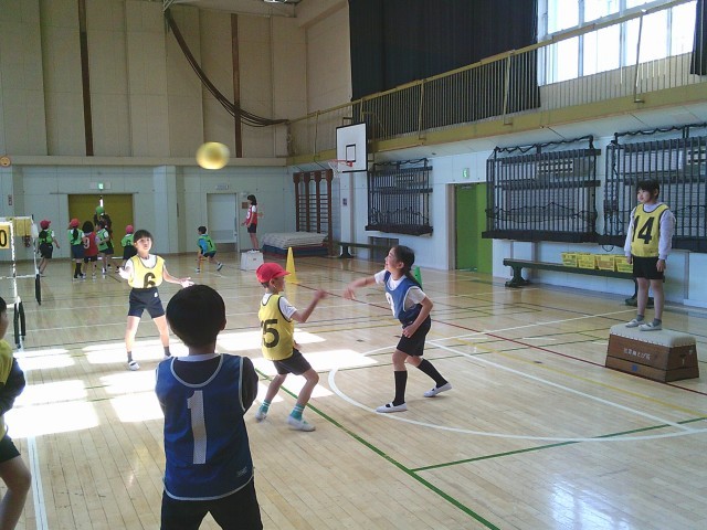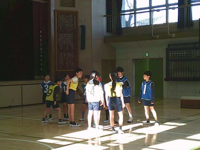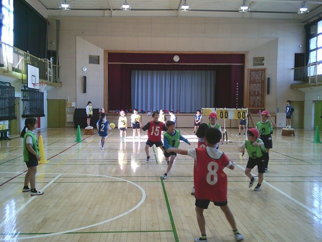 14日(水)3時間目、3年2組は体育の時間でした。「ポートボール」に取り組んでいます。写真は水分補給をしたあとの第2ゲームの様子です。向かい合って挨拶をしてから、先生の笛の合図でゲームが始まりました。