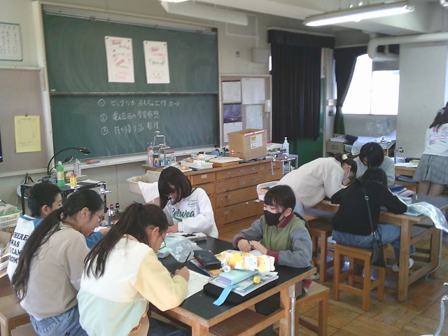 14日(水)4時間目、5年1組は理科の時間でした。「電流が生み出す力」のまとめとして、「ビックリカ おもちゃ工作カード」を仕上げたり、学習感想を書いたりしました。