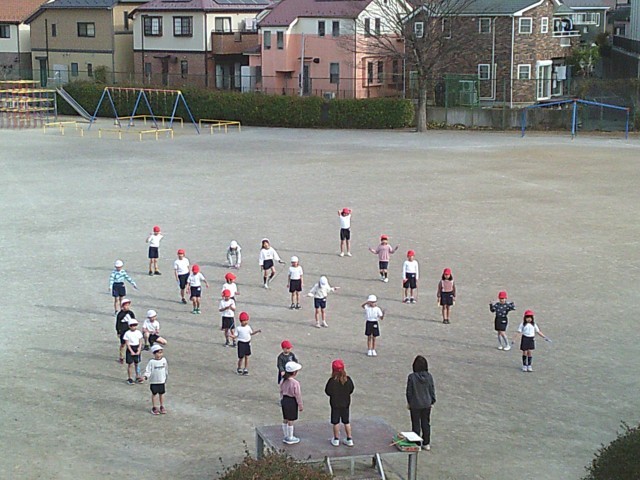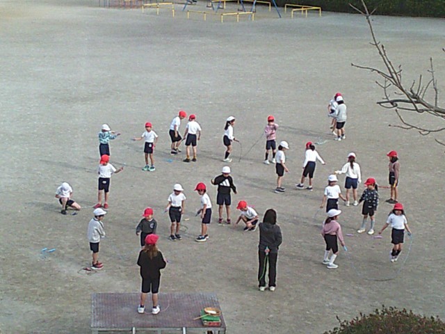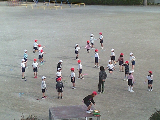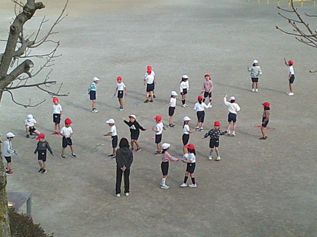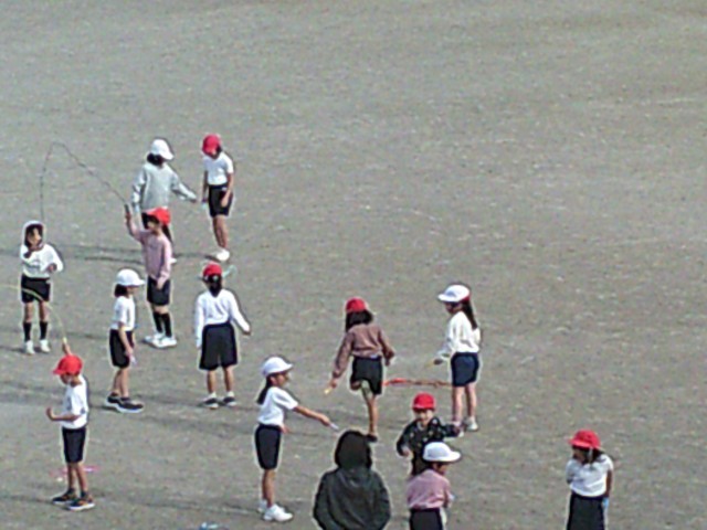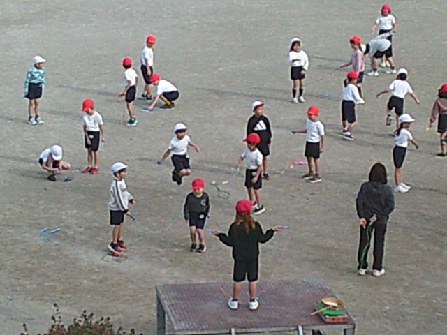 15日(木)5時間目、2年1組は体育の時間でした。係の子どもたちの号令で準備運動をしてから、なわ跳びの練習をしました。朝礼台に二人が上がり、二人組での跳び方を披露しました。お手本を見た子どもたちは早速隣りの人と練習を始めました。後半は、体育倉庫側に移動してボール運動遊びをしました。
