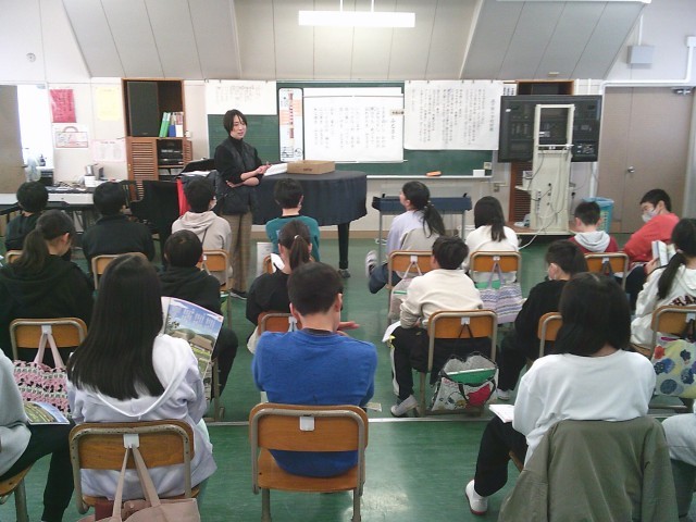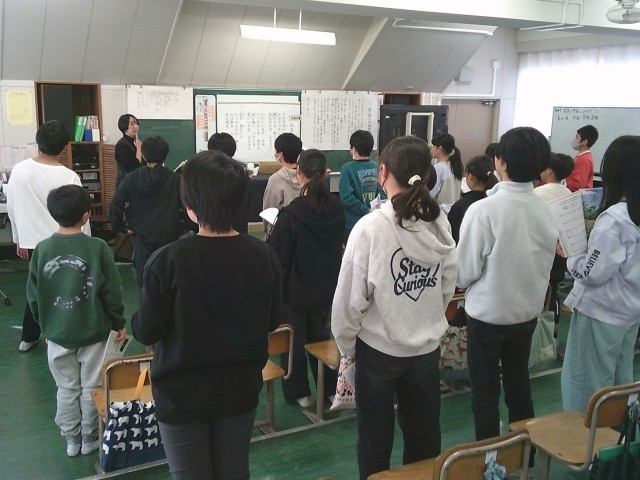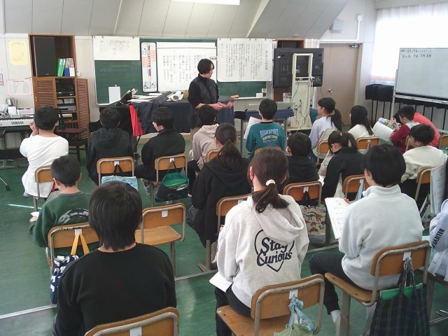 15日(木)5時間目、6年1組は音楽の時間でした。今月の歌「ふるさと」は、6年生の教科書にも登場するので、前半は歌詞の意味を考えました。「忘れがたき」「いかにいます」「つつがなきや」「こころざしをはたして」「かえらん」など、子どもたちは予想を発表したり、先生の解説を聞いたりしました。その後、立って3番まで歌いました。後半は、6年生を送る会で披露する予定の合奏曲を初めて聞きました。