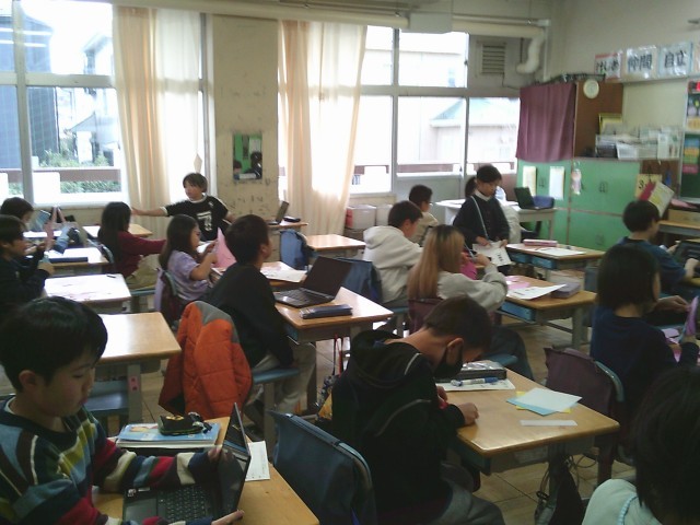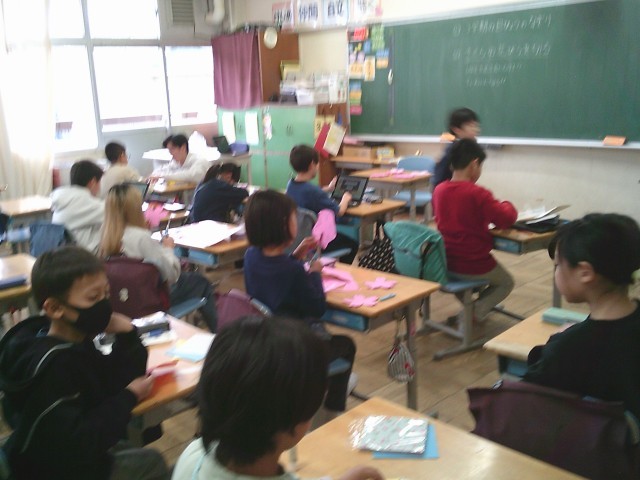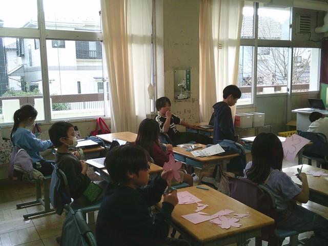 15日(木)6時間目、3年1組は学級活動の時間でした。6年生の卒業を新1年生の入学をお祝いする「桜の花」作りをしました。印刷してある花をハサミを使って丁寧に切っていました。終わった人はタブレット端末を出して、タイピングに取り組んでいました。